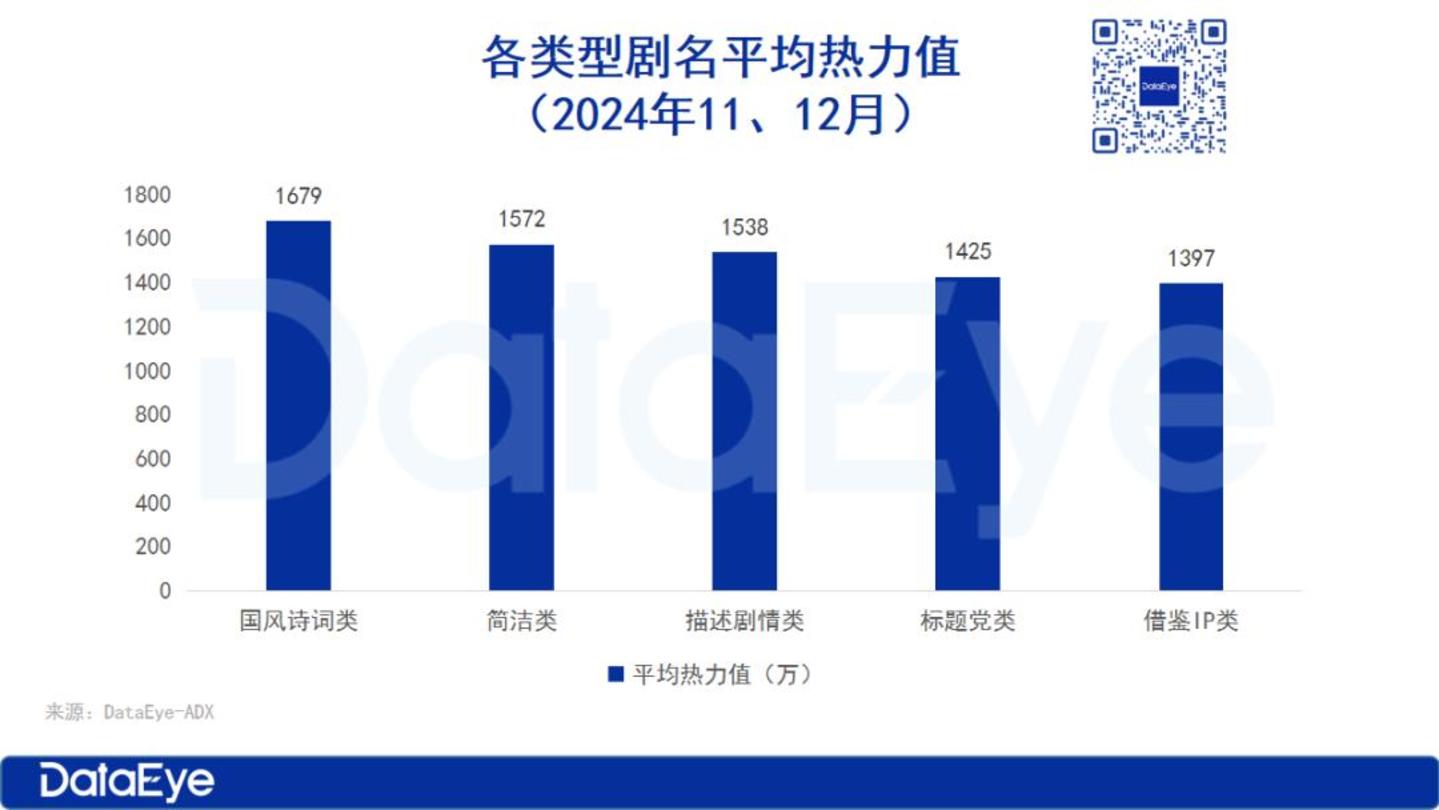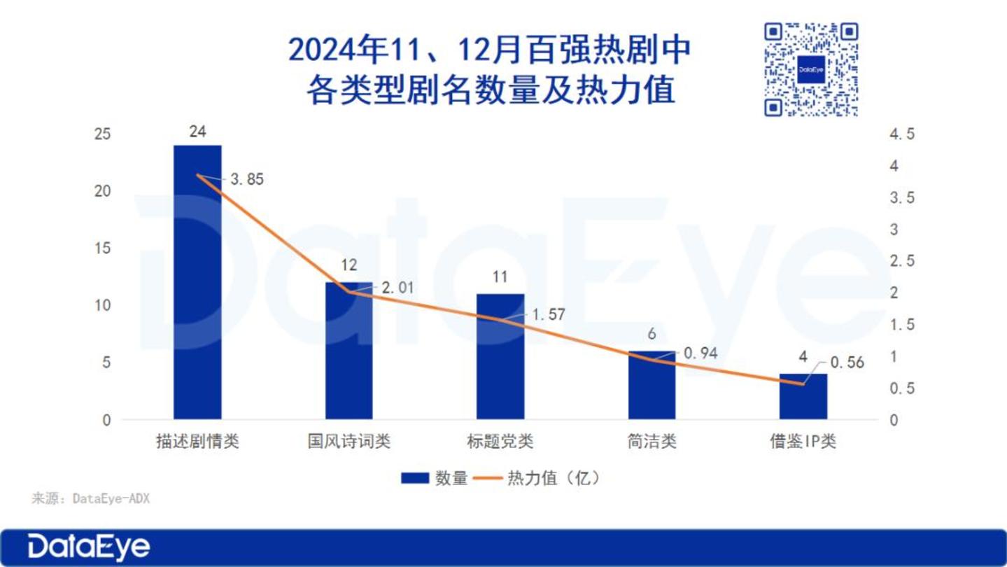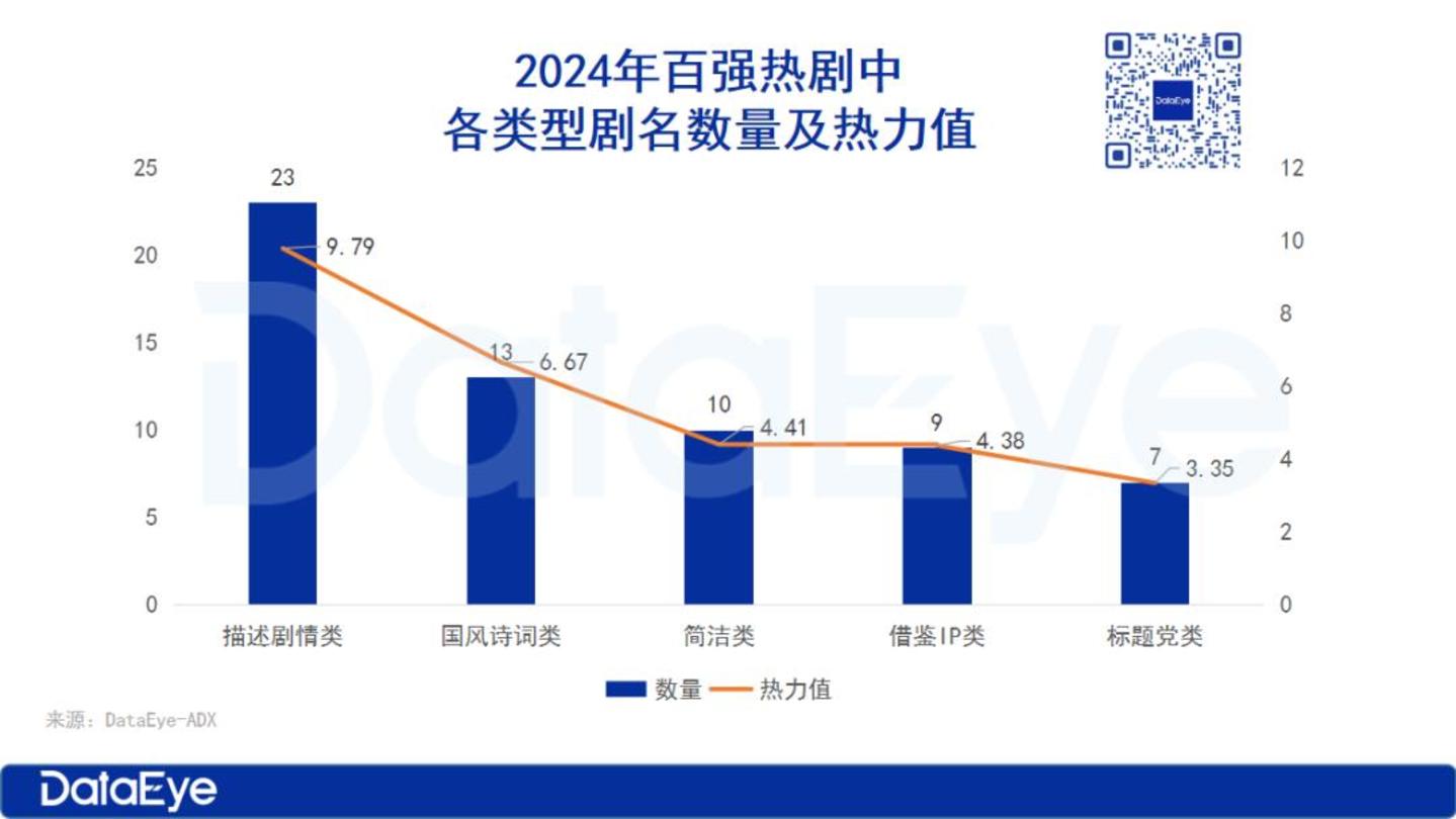 DataEye整理了2024年百强热剧和广电总局发布“加强微短剧片名审核管理提示”前后的11、12月的百强热剧,筛选了国风诗词类、借鉴IP类、简洁类、标题党类和描述剧情类五个类别。
