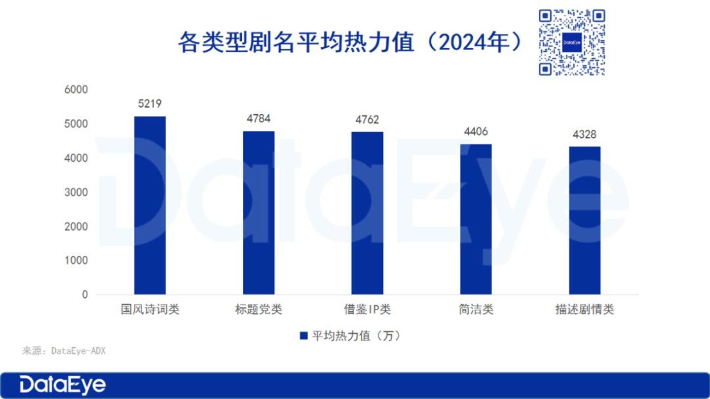从平均热力值来看,国风诗词类剧名的短剧依然排名第一,而标题党类和借鉴IP类的剧名类型排名则均下降两名。