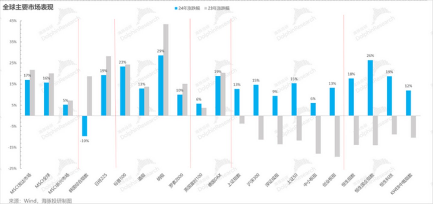 但从资本市场来看,悲观者或许正确,但乐观者才是真正赚的钱的群体。回顾2024年全球市场的核心指数: