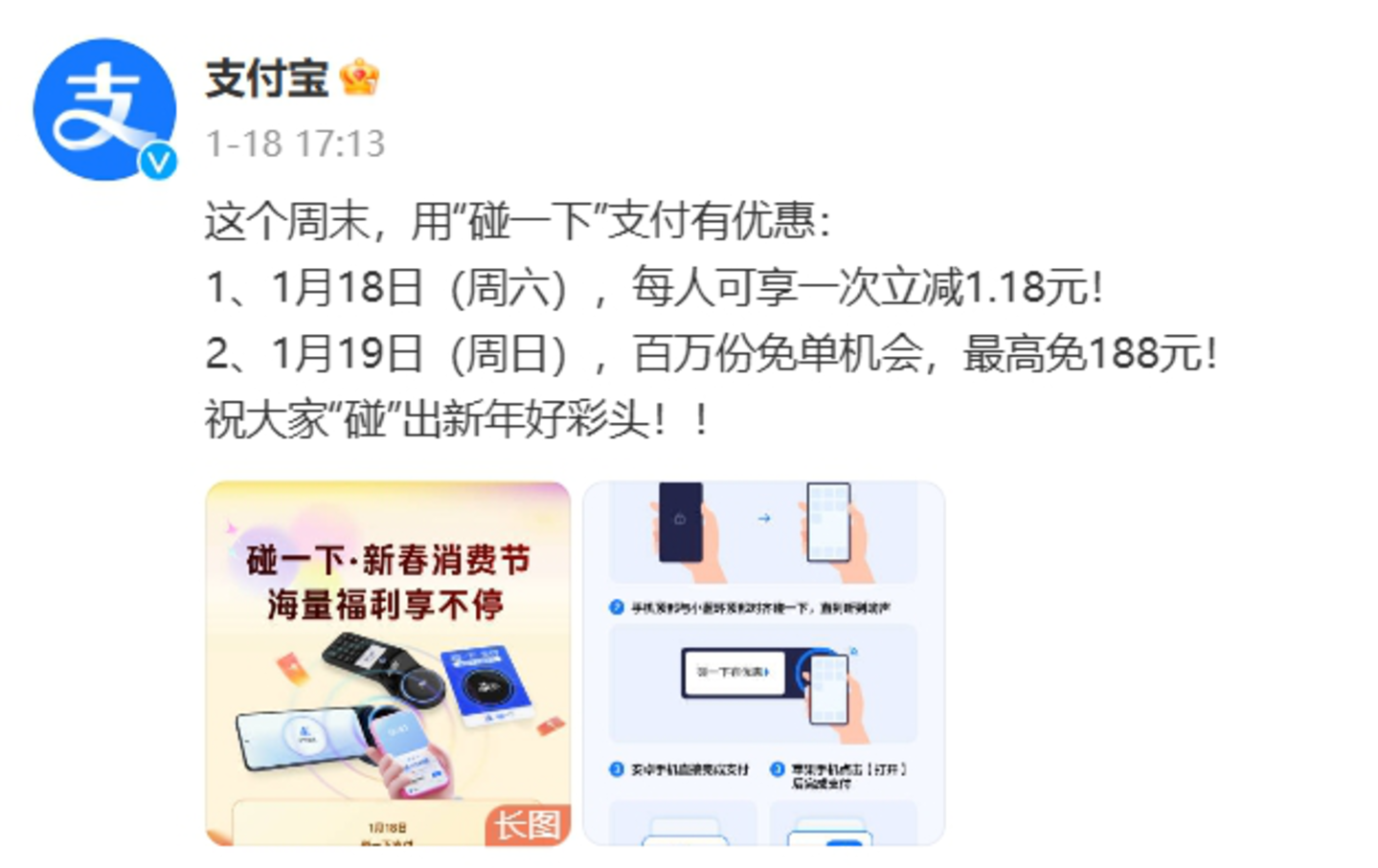 临近春节,支付宝更不会放过这个交易高峰节点。1月20日,延续第十年的集五福活动启动,得福卡的方式中特意增加了“碰一下”支付;1月21日,支付宝又宣布启动“你敢碰我敢赔”保障计划,承诺用户使用“支付宝碰一下”支付过程中如发生被盗,经核实后支付宝将作全额赔付。