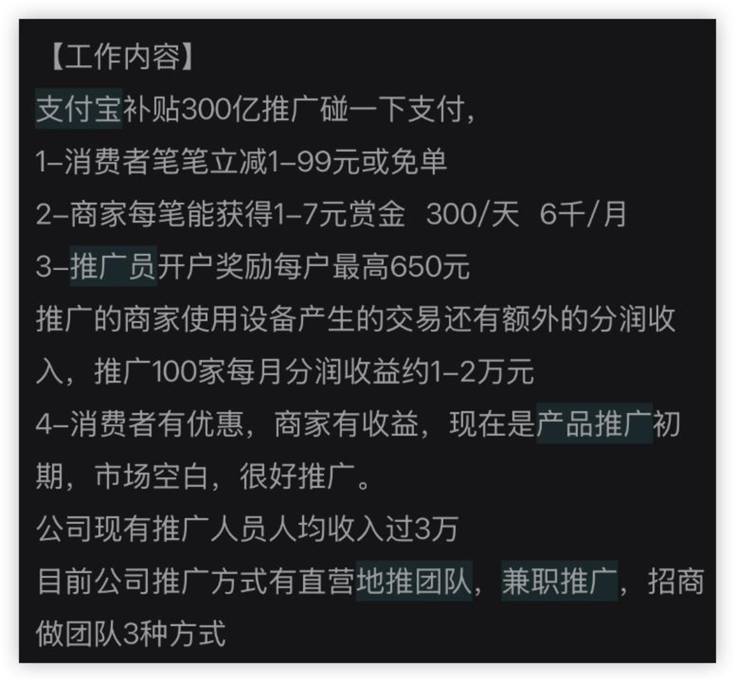 不像扫码支付,商户打印一张收款码就能实现。“碰一下”需要商户安装一个支付宝定制的实体的设备,加上讲清楚技术原理也需要费一番口舌,所以地推服务商和推广员是必不可少的。