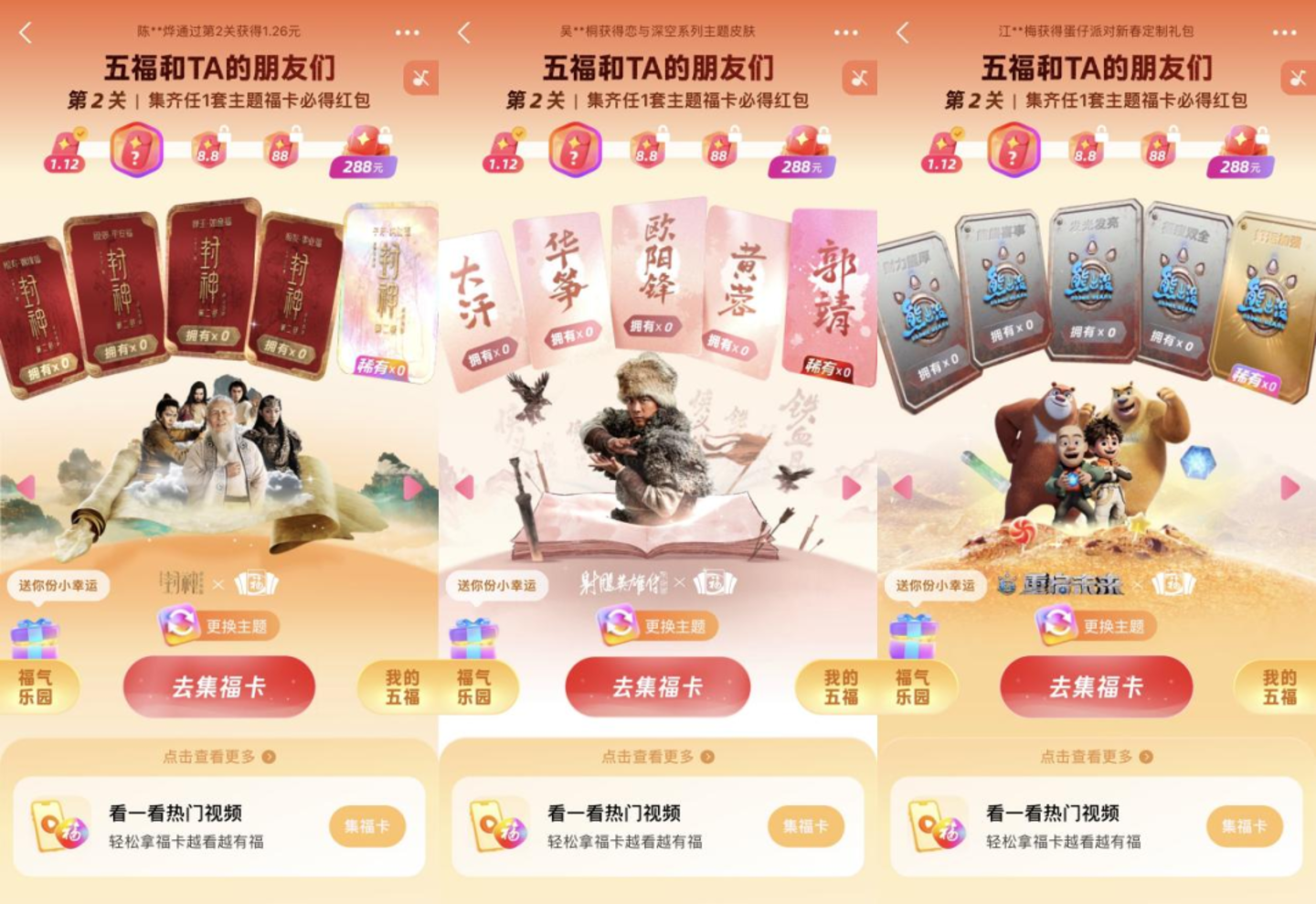 而支付宝集五福活动作为最重要的赛博年味仪式,也加入了今年春节档的线上宣发,集齐了《封神第二部:战火西岐》《射雕英雄传》和《熊出没:重启未来》三部影片作为集福主题。