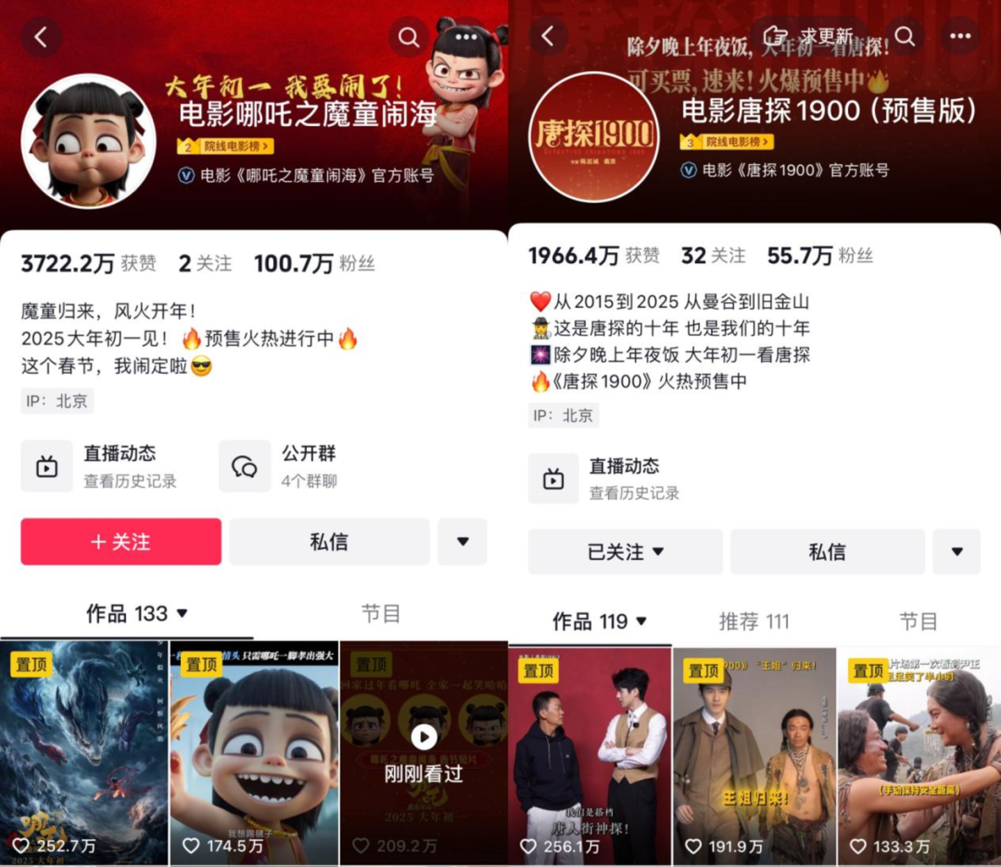 《哪吒之魔童闹海》官方抖音账号(左)及《唐探1900》官方抖音账号(右)