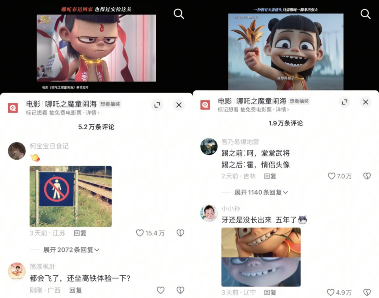 《哪吒之魔童闹海》官方抖音,粉丝在评论区玩梗回复