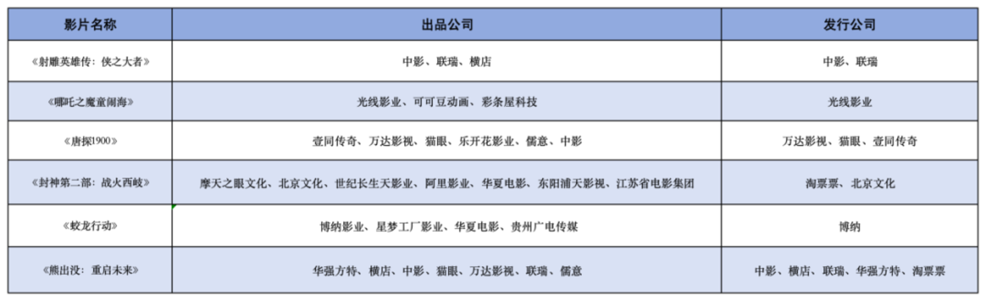 春节档影片出品、发行公司信息 信息来源灯塔数据专业版