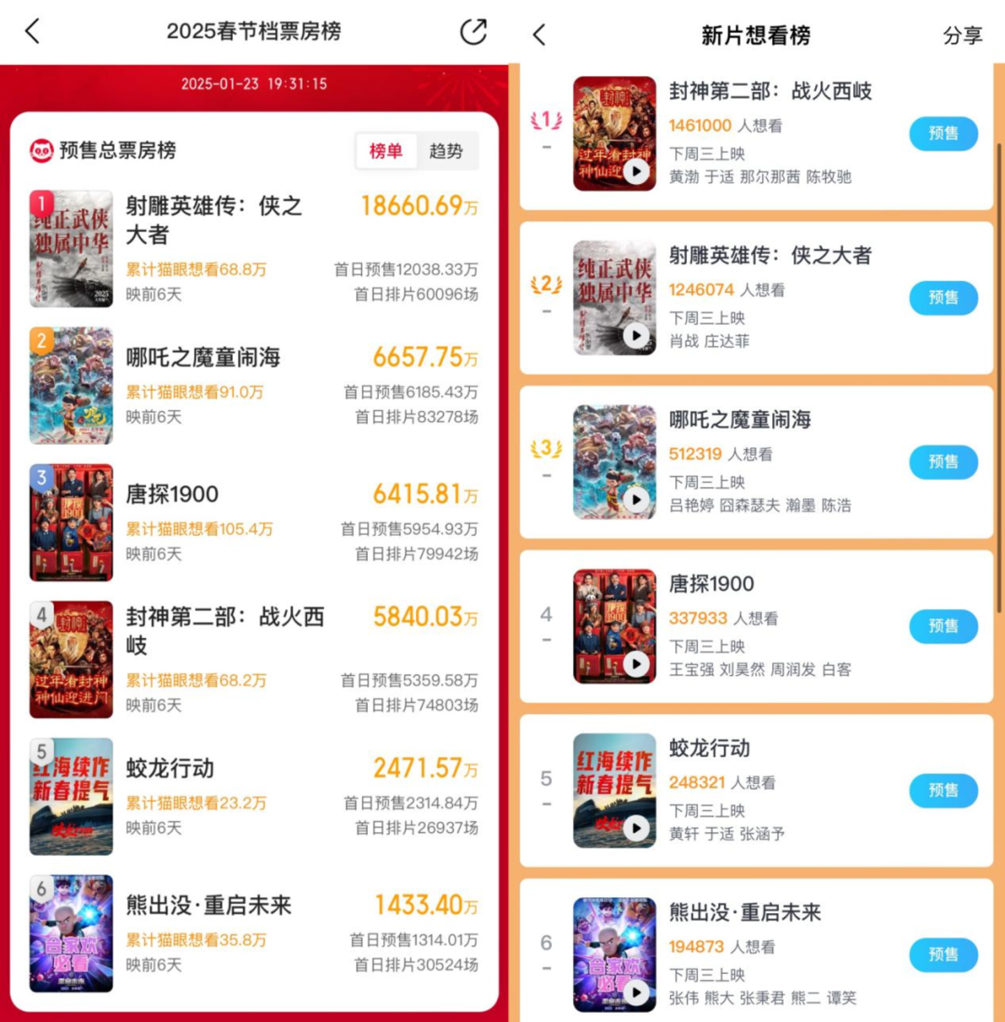 猫眼春节档榜单(左)淘票票想看榜单(右)