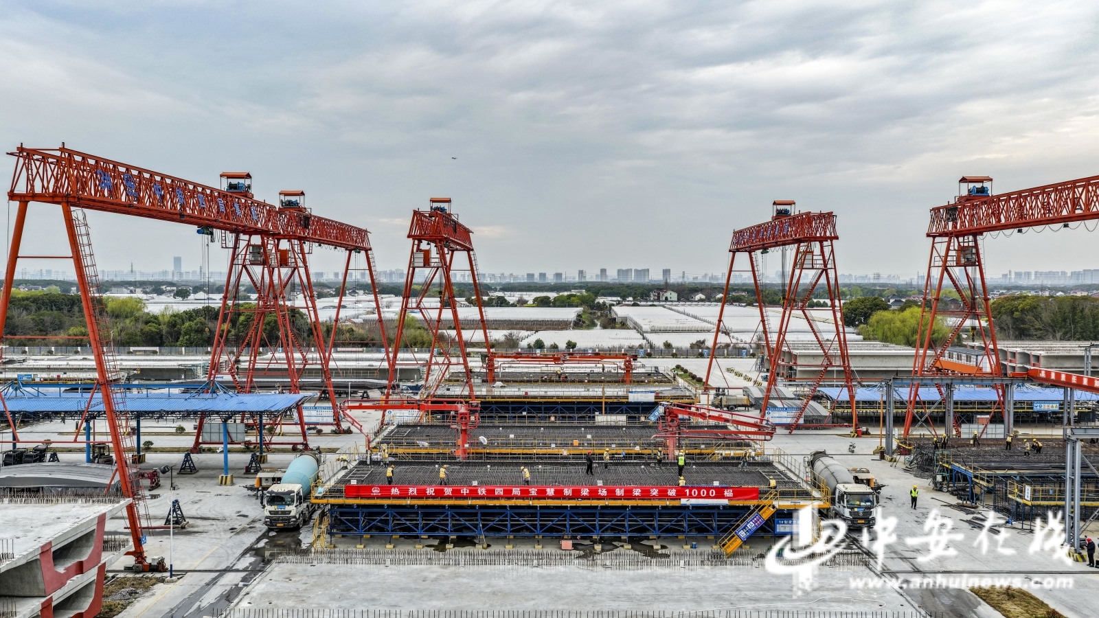 中安在线、中安新闻客户端讯 3月26日下午,随着一榀长32.6米、重673吨的箱梁顺利完成浇筑,位于上海市宝山区的亚洲最大高铁制梁场——中铁四局沪宁合高铁沪宁段Ⅱ标宝慧制梁场预制箱梁产量成功突破1000榀大关,标志着沪宁合高铁沪宁段及沪通铁路二期工程建设取得重要阶段性成果,为后续大规模架梁施工和全线贯通奠定了坚实基础。