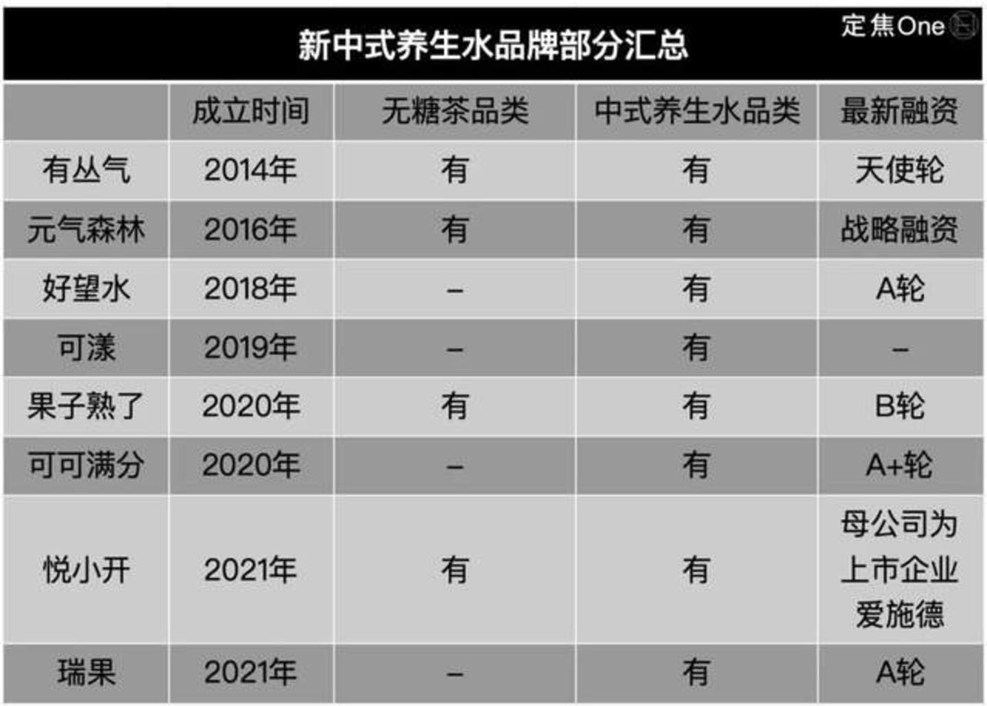 在瓶装的中式养生水品类里,目前重点跟进的品牌基本都是创业公司,无糖茶行业的大玩家农夫山泉、统一、康师傅、娃哈哈等传统饮料巨头,目前还没有跟进养生水品类。