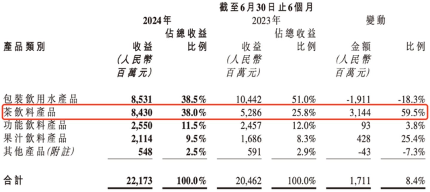 根据农夫山泉的财报,2024年上半年,其收入达221.73亿,同比增长8.4%。其中,饮用水的收入同比下降18.3%,茶饮料的收入同比增长近60%,在总收益中的占比与饮用水齐平。