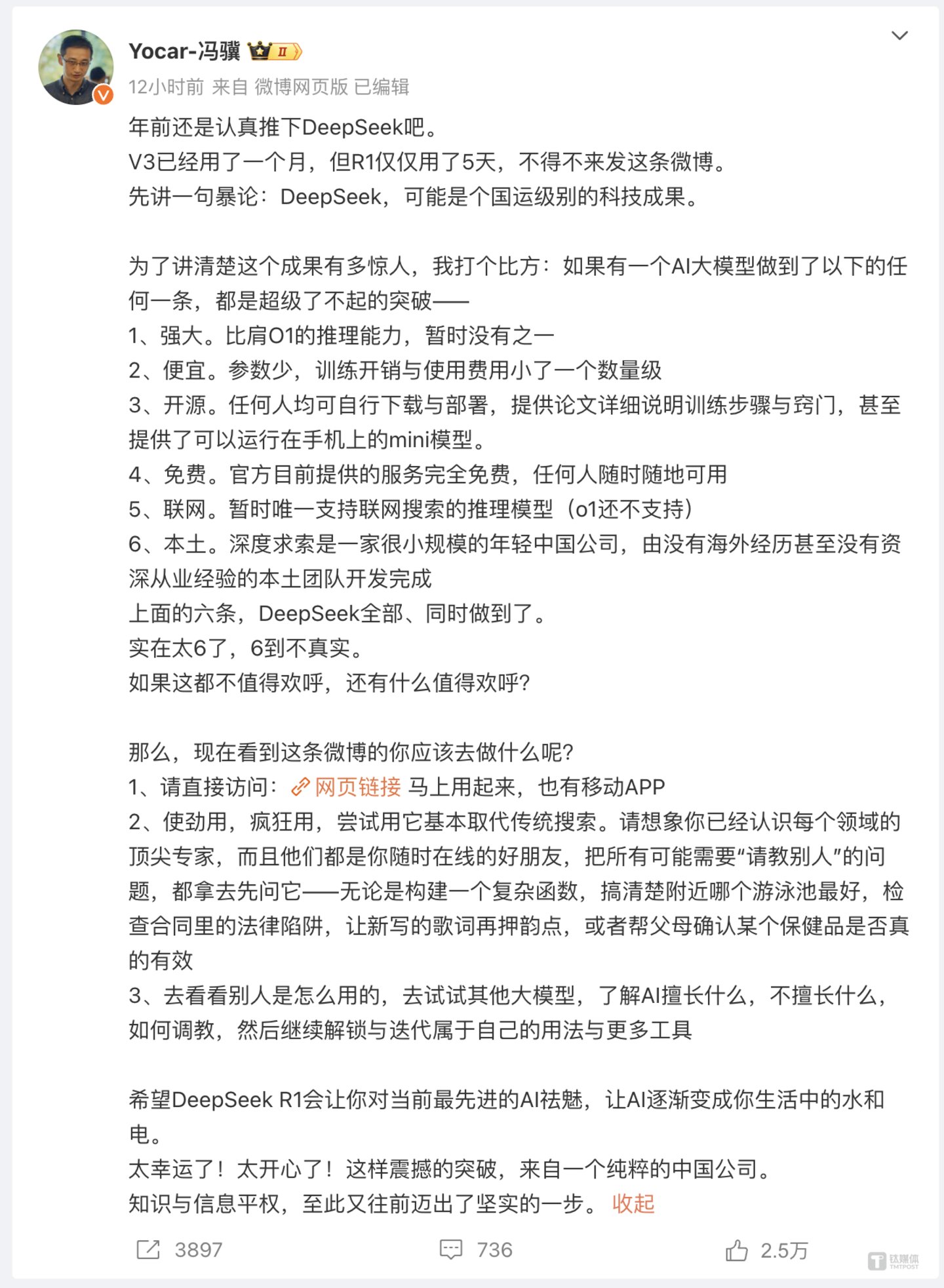 游戏科学创始人、《黑悟空》制作人冯骥则表示:年前还是认真推下DeepSeek吧。V3已经用了一个月,但R1仅仅用了5天,不得不来发这条微博。先讲一句暴论:DeepSeek,可能是个国运级别的科技成果。“太幸运了!太开心了!这样震撼的突破,来自一个纯粹的中国公司。知识与信息平权,至此又往前迈出了坚实的一步。”