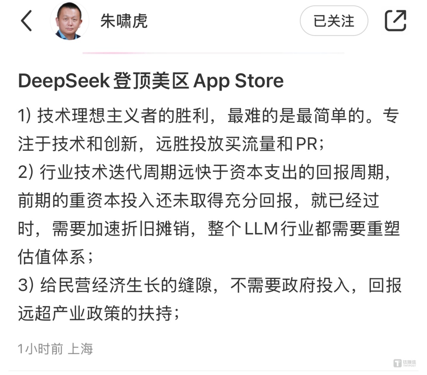金沙江创业投资基金主管合伙人朱啸虎表示,DeepSeek 登顶美区App Store:1) 技术理想主义者的胜利,最难的是最简单的。专注于技术和创新,远胜投放买流量和PR;2)行业技术迭代周期远快于资本支出的回报周期,前期的重资本投入还未取得充分回报,就已经过时,需要加速折旧摊销,整个LLM行业都需要重塑估值体系;3) 给民营经济生长的缝隙,不需要政府投入,回报远超产业政策的扶持。