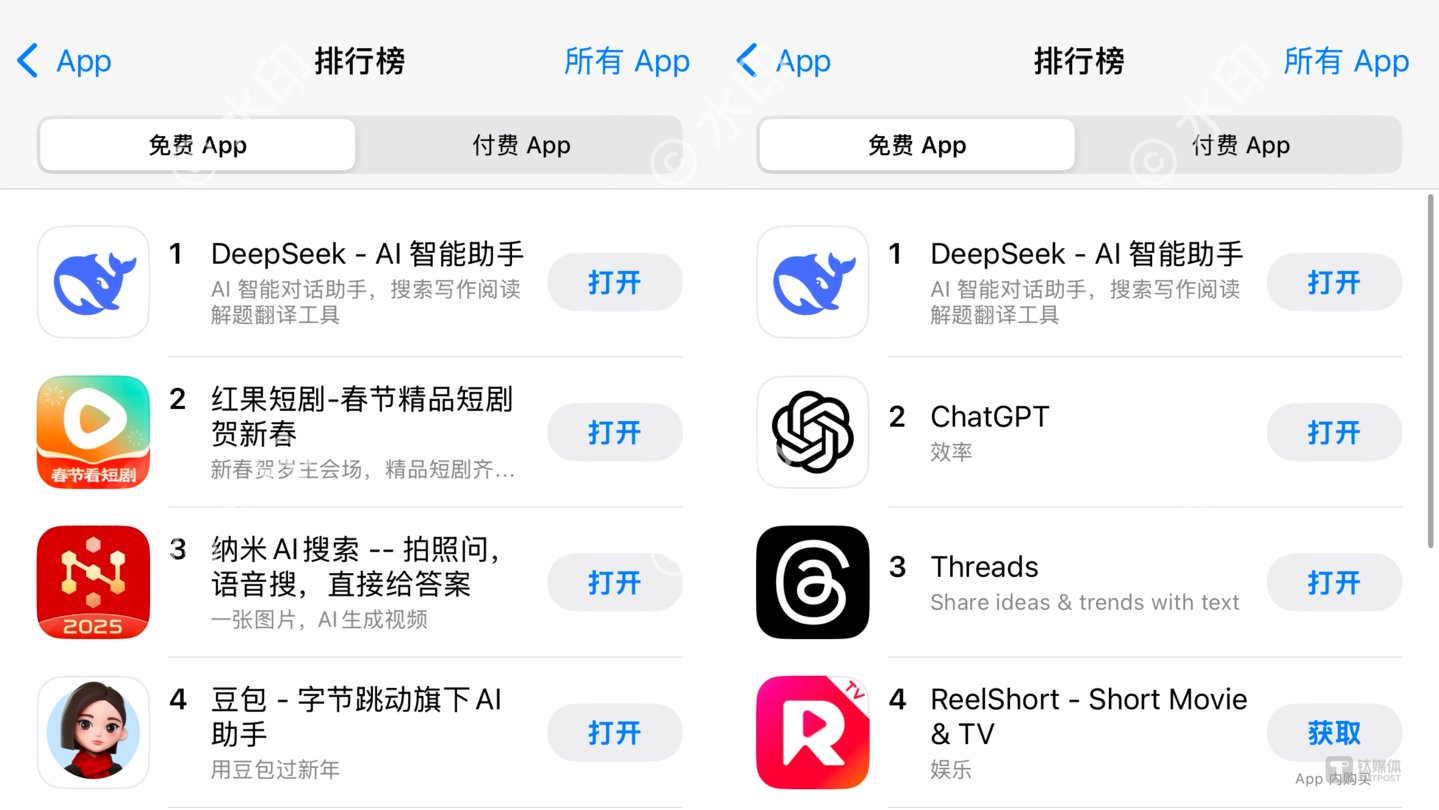 1月27日上午,Deepseek应用登顶苹果中国地区和美国地区应用商店免费APP下载排行榜,在美区下载榜上超越了ChatGPT,在国区超越了豆包、抖音等。