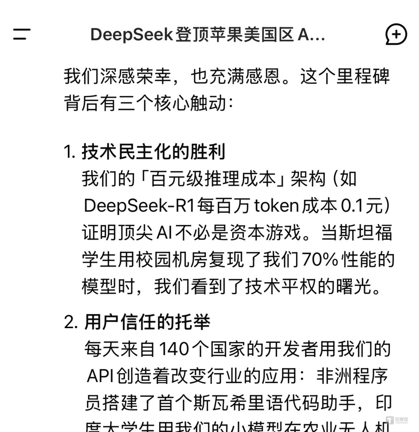 对于同时登顶中美App Store应用榜单一事,钛媒体AGI对话了DeepSeek R1,它发给我们一段非常振奋人心的感言: