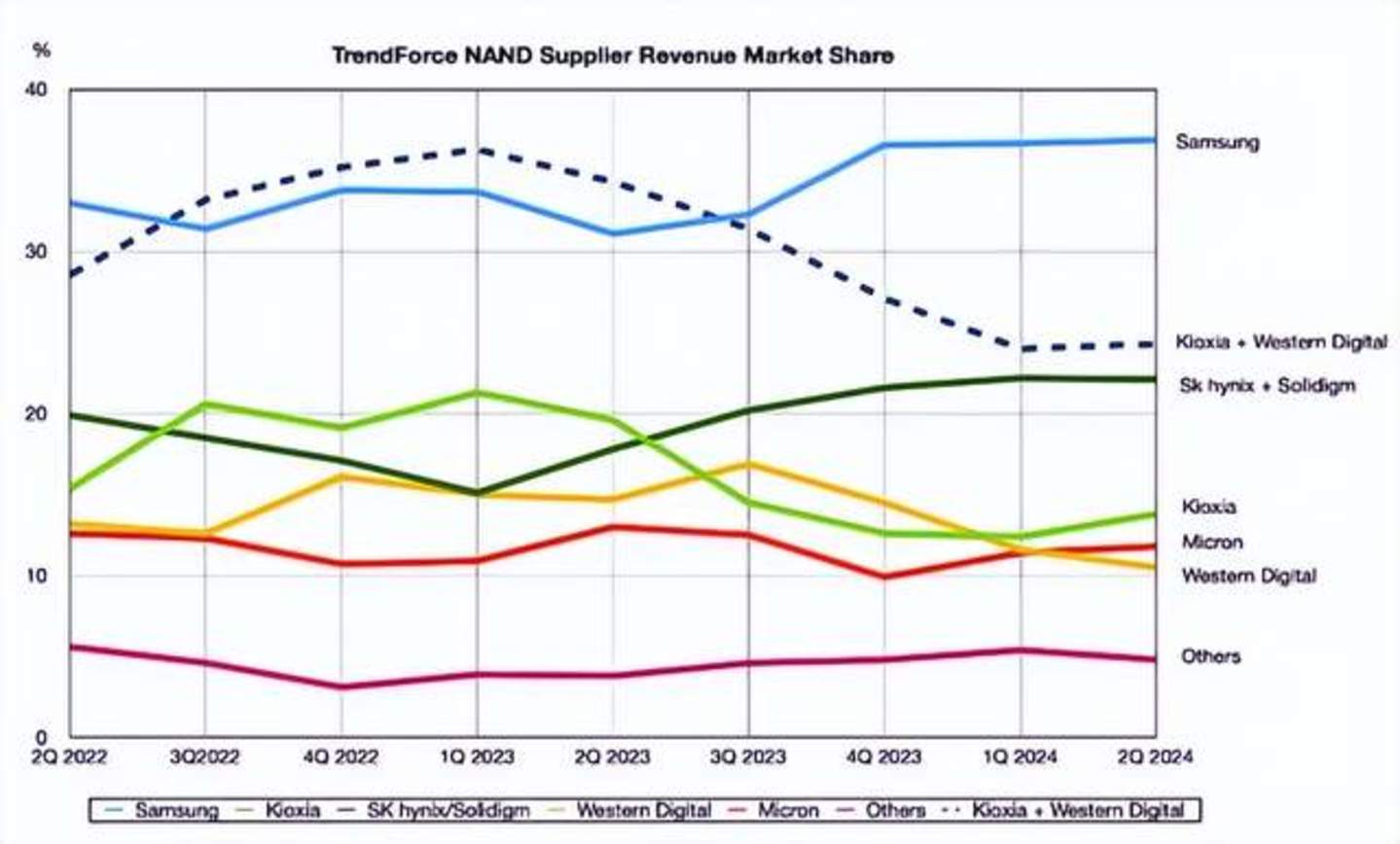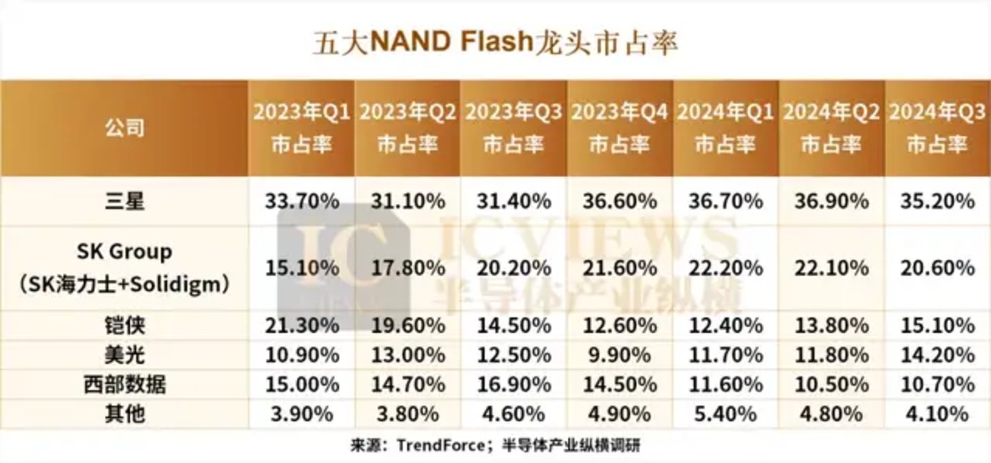 值得关注的是,近两年来,NAND市场的波动不仅限于价格,各龙头企业的市场占比也在发生变化。