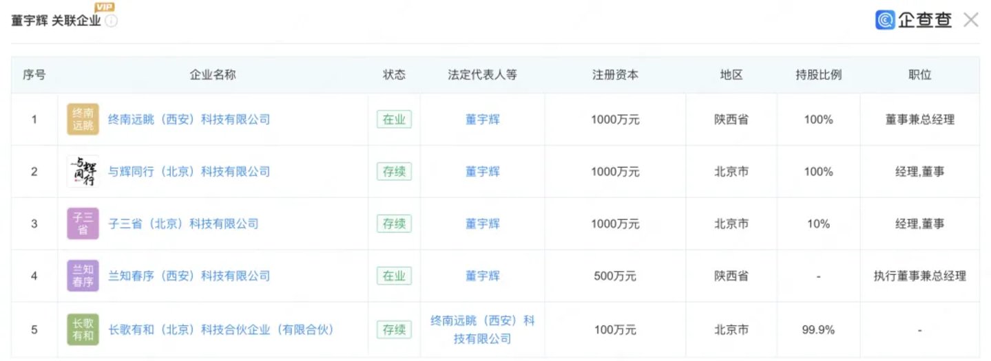 去年下半年开始,董宇辉除了掌舵与辉同行外,又接连成立4家公司。其中,终南远眺主营业务旅游开发、票务代理等,意味着进军文旅产业,另一由董宇辉直接持股99.9%、间接持股0.1%的长歌行,许可项目也是旅游业务。子三省和兰知春序则分别是演出经纪、节目制作,以及旅游服务等。