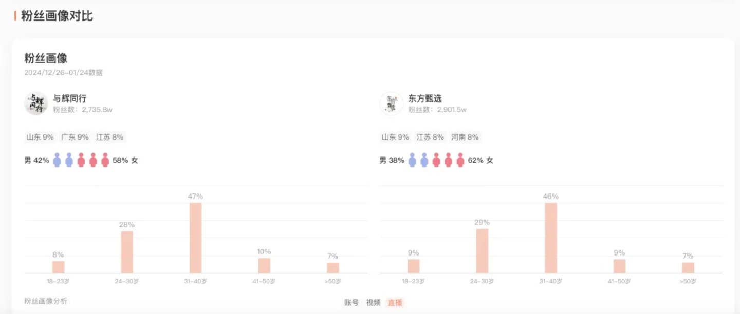 这种相似在预料之内,毕竟这是由早期直播间风格、核心受众群所决定的,目前为止双方的直播粉丝画像也保持着高一致性,主要都是31-40岁、女性占比更高。这也意味着,在未来的很长一段时间内,双方背后的选品逻辑、价格机制都很难有大的改变。