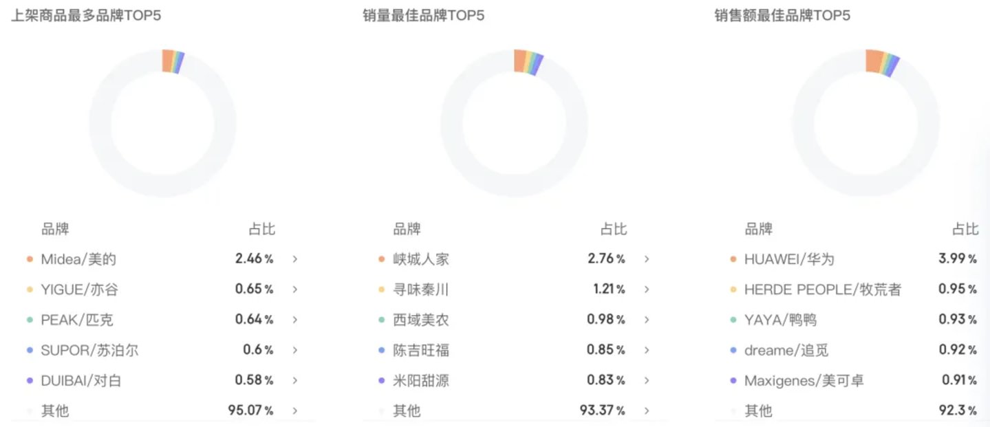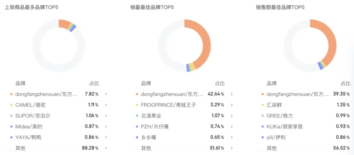 反观与辉同行直播间,并没有强品牌化,虽然位列商家商品数、销量、销售额TOP1的分别是美的、峡城人家、华为,但在总占比中并不高。这说明背后的团队在选品时,并没有强品牌导向。