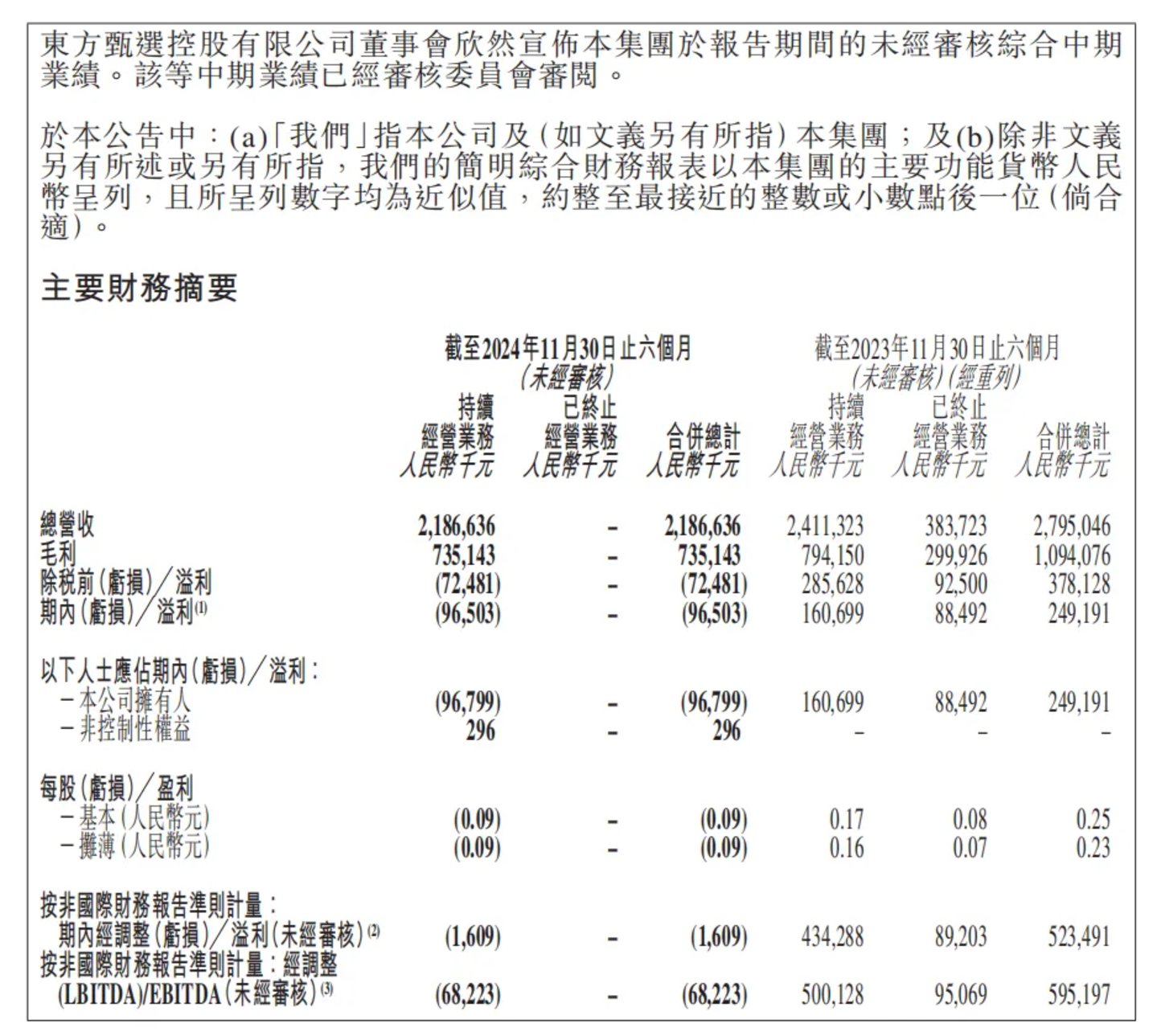 1月21日,东方甄选发布2025财年上半年(2024年6月至2024年11月)财报,上半年,东方甄选总营收为21.87亿元、同比下降9.3%;净亏损为9650万元,而2024财年同期,东方甄选的利润为2.49亿元。若剔除出售与辉同行的财务影响,则为净盈利3270万元。