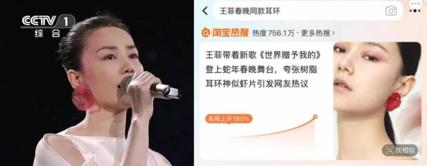 当然,晚会的带货顶流还得是王菲,在搭配这件事上,不少网友戏称,王菲“营业即王炸”。时隔七年,再登春晚舞台,第一个火出圈的竟是神似虾片的树脂耳环,数据显示,该品一周内搜索上升180%,淘宝热搜热度达到756万,不少商家快速跟进同款,一位商家在宝贝标题写道:“耳饰预售,3月初发。”不仅耳环,王菲表演时的发际线腮红妆也一度引起广泛讨论。