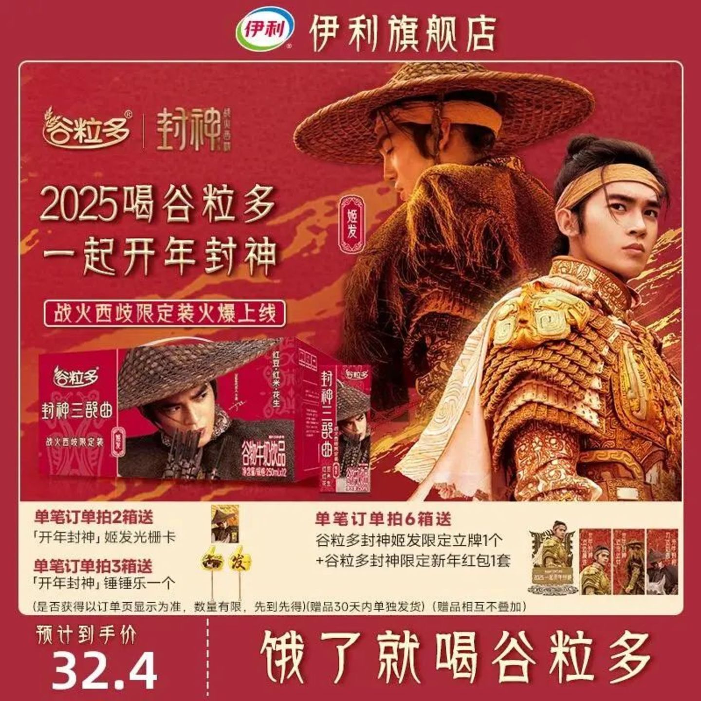 同样是乳制品巨头,相较于蒙牛的强绑定,伊利则选择“广撒网”,不同产品与四部电影均有合作,伊利安慕希与《唐探1900》合作,伊利牛奶与《蛟龙行动》合作,伊利QQ星与《熊出没之重启未来》合作,伊利谷粒多与《封神第二部》合作。