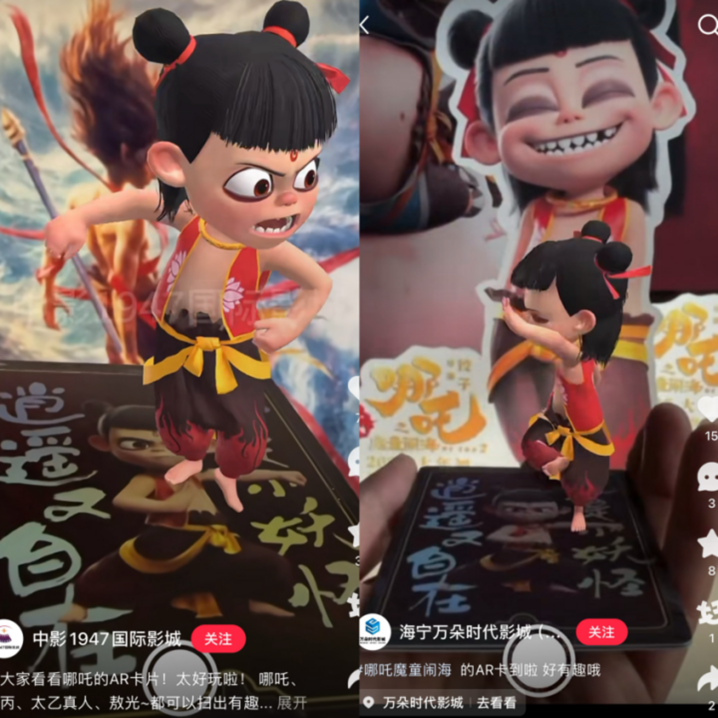 此次《哪吒之魔童闹海》的PR卡包中就包含集卡社联合片方特别推出的AR卡。从影城晒出的视频来看,这种AR卡可以让人物形象更立体化和生动化,也增强了卡牌玩法的互动性与趣味性,一经发布就吸引了一众粉丝喜爱。