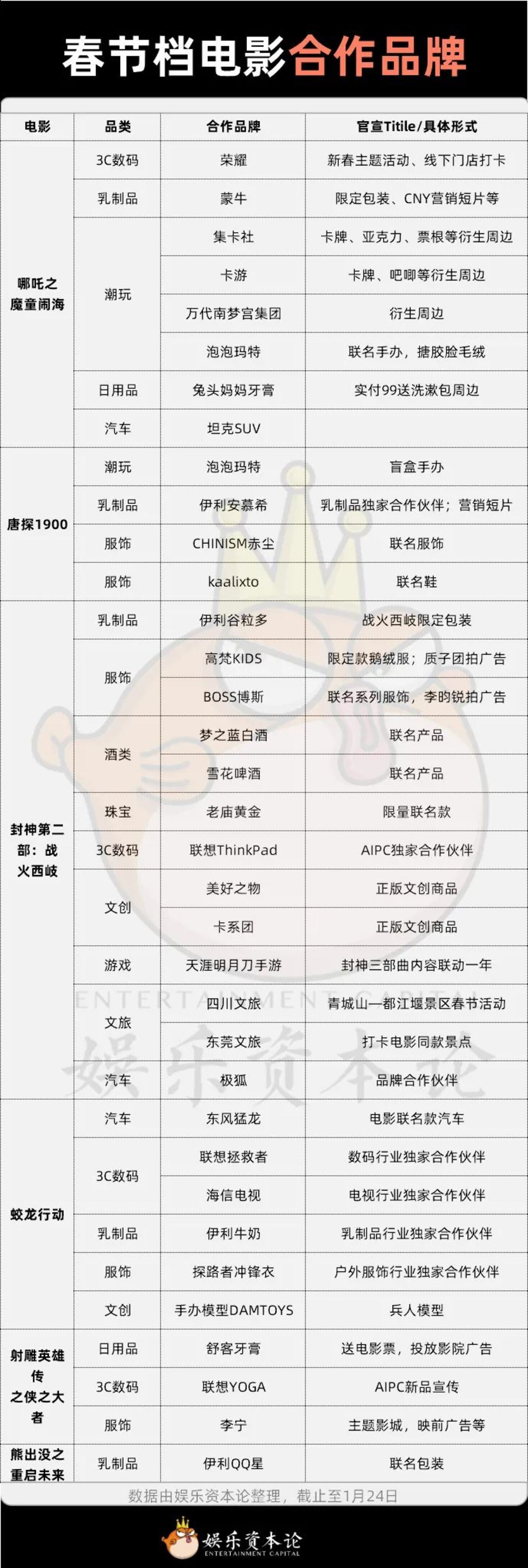 据娱乐资本论统计,截止至1月24日,已有35家品牌官宣了与春节档电影的合作,其中《封神第二部》的联名品牌以13家居于首位,涵盖乳制品、服饰、酒类、珠宝、3C数码、潮玩、文旅、游戏等多个品类。