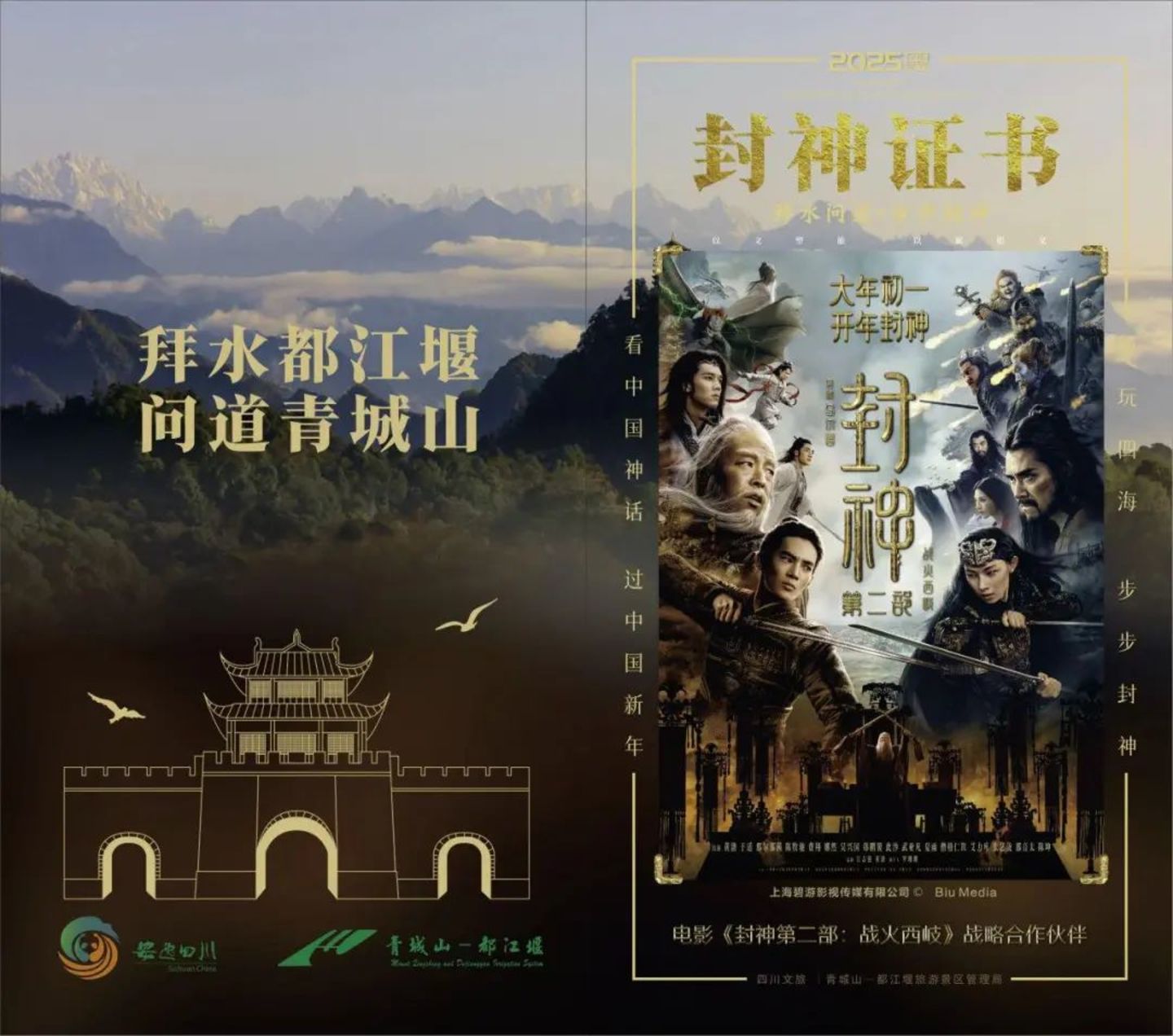 在《封神第二部》的联名合作中,比较特别的是文旅向的合作。青城山-都江堰景区将依托电影《封神第二部:战火西岐》,与四川文旅厅、阿里影业合作,在大年初一至初三开展“拜水问道·步步封神”主题线路打卡活动。东莞文旅也在近期官宣,欢迎大家打卡《封神第二部》同款地点。