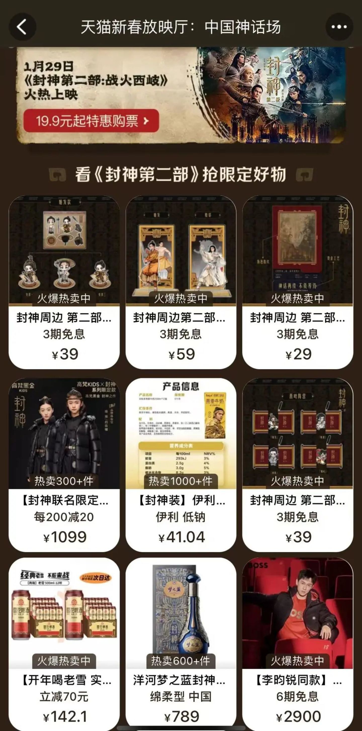 在联名产品的营销渠道与转化效率上,由阿里影业出品、淘票票发行的《封神第二部》占据不少优势。在淘宝搜索“哪吒”“妲己”等《封神第二部》主角关键词,会弹出主题活动页面,搜索点亮全部角色后可抽奖一次,大奖是电影主创见面会。活动页面下方有《封神第二部》多个联名产品的购买链接,借助阿里系平台宣发优势,通过内部协同,这些封神IP联名商品可以助力商家和货品直达核心人群,实现从种草到转化的闭环。