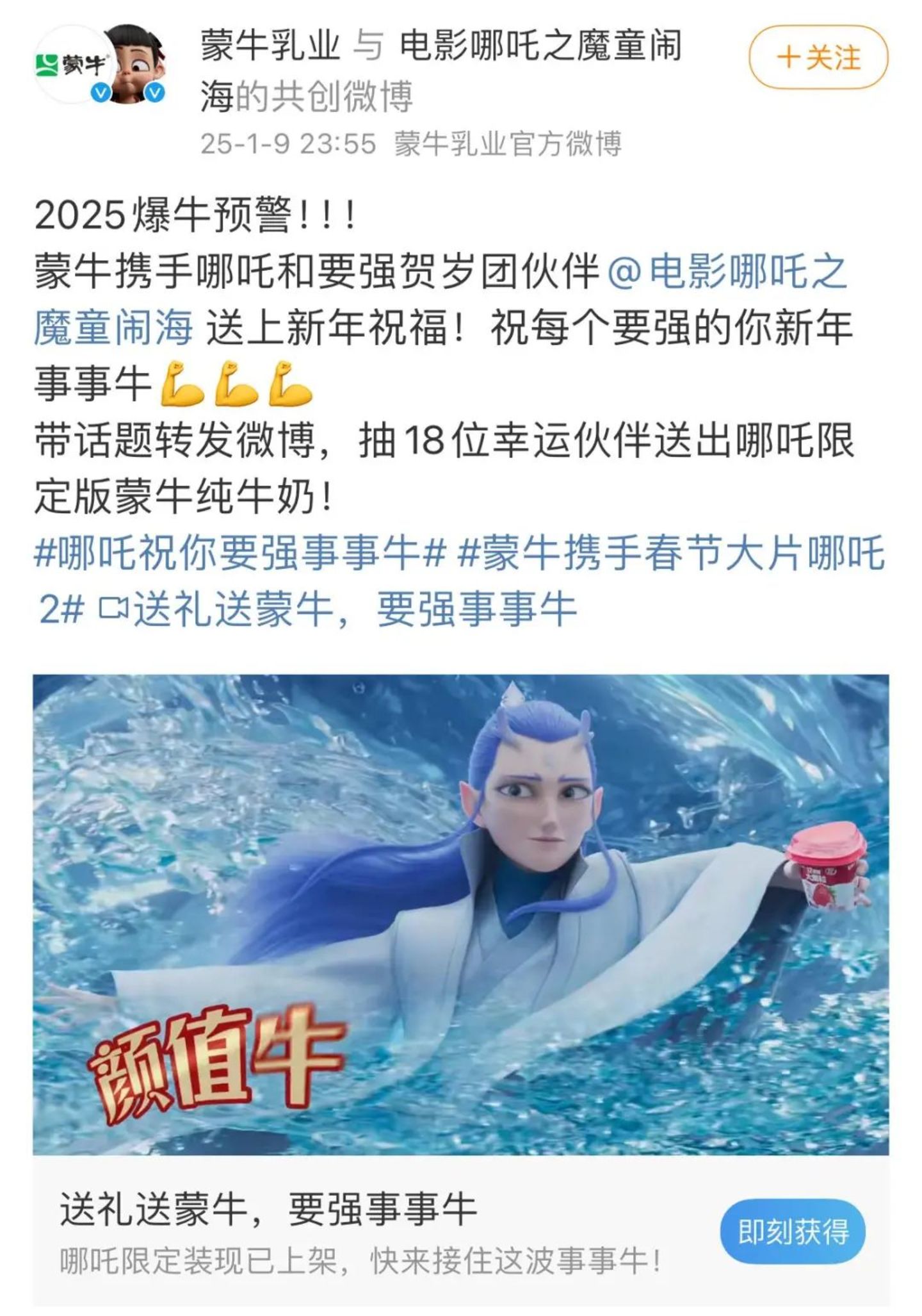 从品牌合作深度上来说,《哪吒之魔童闹海》与蒙牛的深度绑定是一个典型案例。官宣时,龚俊、张若昀、杨紫、檀健次四位蒙牛代言人都拍摄了短片邀请哪吒加入大家庭。导演饺子亲自操刀一则蒙牛CNY营销短片,将今年蒙牛春节营销slogan“要强事事牛”进行强输出。蒙牛旗下纯牛奶、真果粒、纯甄、圣牧有机奶、未来星等数个产品均换上了哪吒限定包装,并在线下商超广泛铺货。最近蒙牛旗下的母婴奶粉品牌瑞哺恩又释出了一则哪吒剧情短片,可见物料充足,节奏稳定,合作程度也非常深。