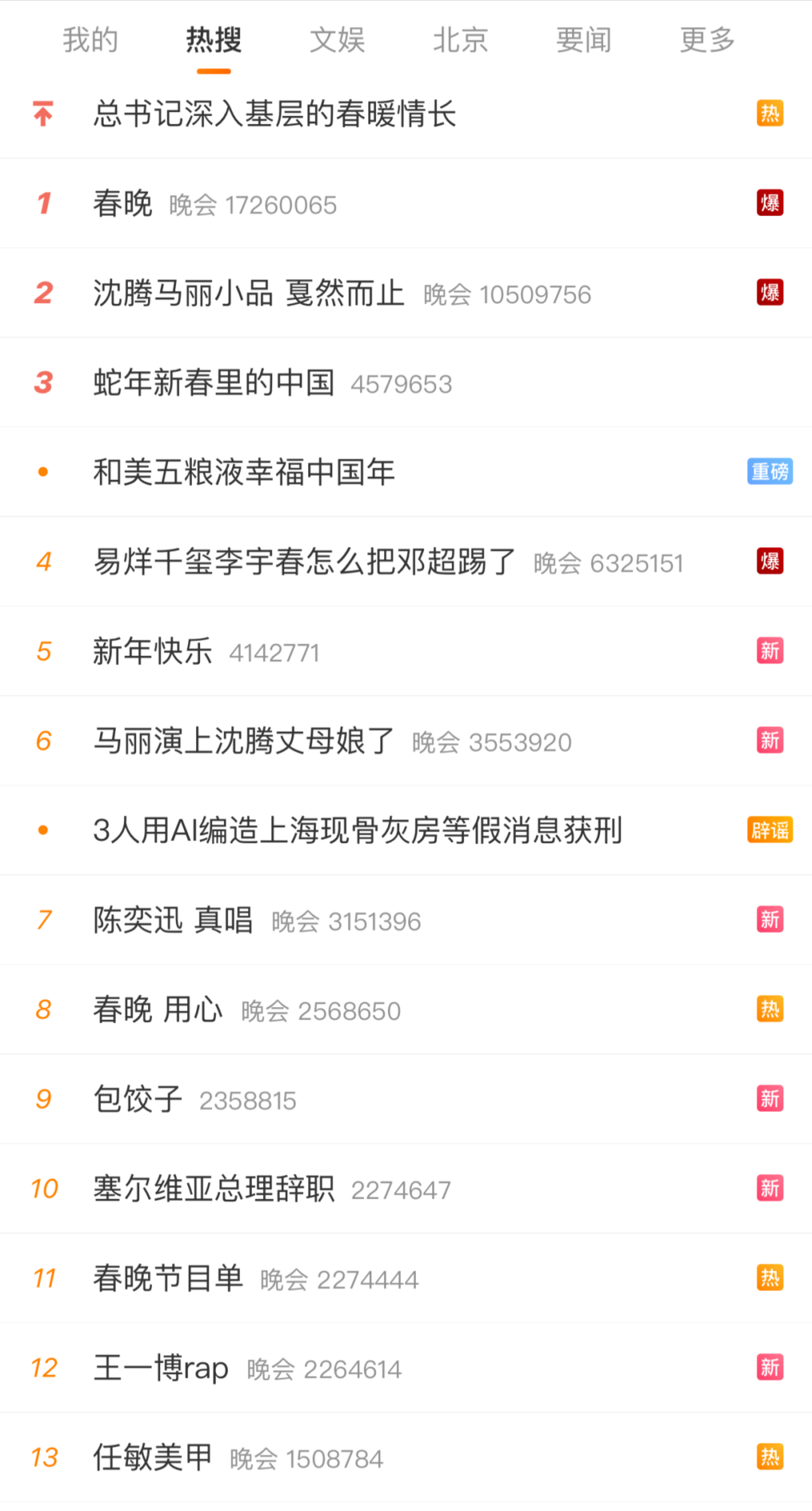 春晚也是除夕当天的热搜策源地。昨天接近0点之前,前15大热搜中只有三四个词条与春晚无关,明星登台、有趣的细节,一切能引发人们讨论的内容都有可能出现在热搜上。
