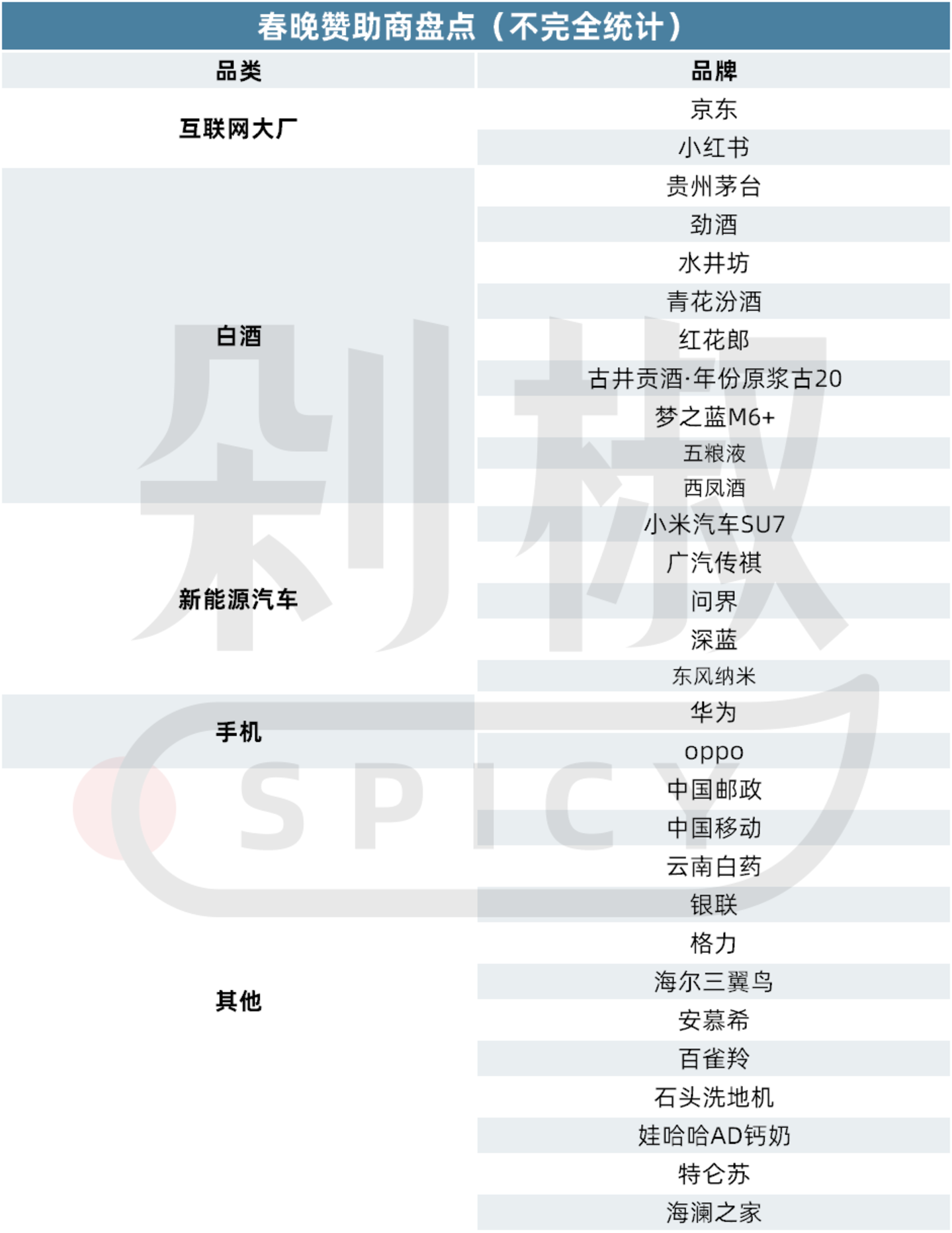 品牌层面,无疑汽车和白酒是头部军团。五粮液、红花郎、劲酒、海之蓝、西凤酒、洋河梦之蓝、古井贡年份原浆,保持着与去年基本持平的数量,值得关注的是,行业老大茅台缺席了今年春晚;小米SU7、华为旗下问界、尊界,长安启源、深蓝、岚图梦想家......超强现金流类目+新经济代表行业,春晚的赞助商构成,某种程度就是市场的晴雨表。