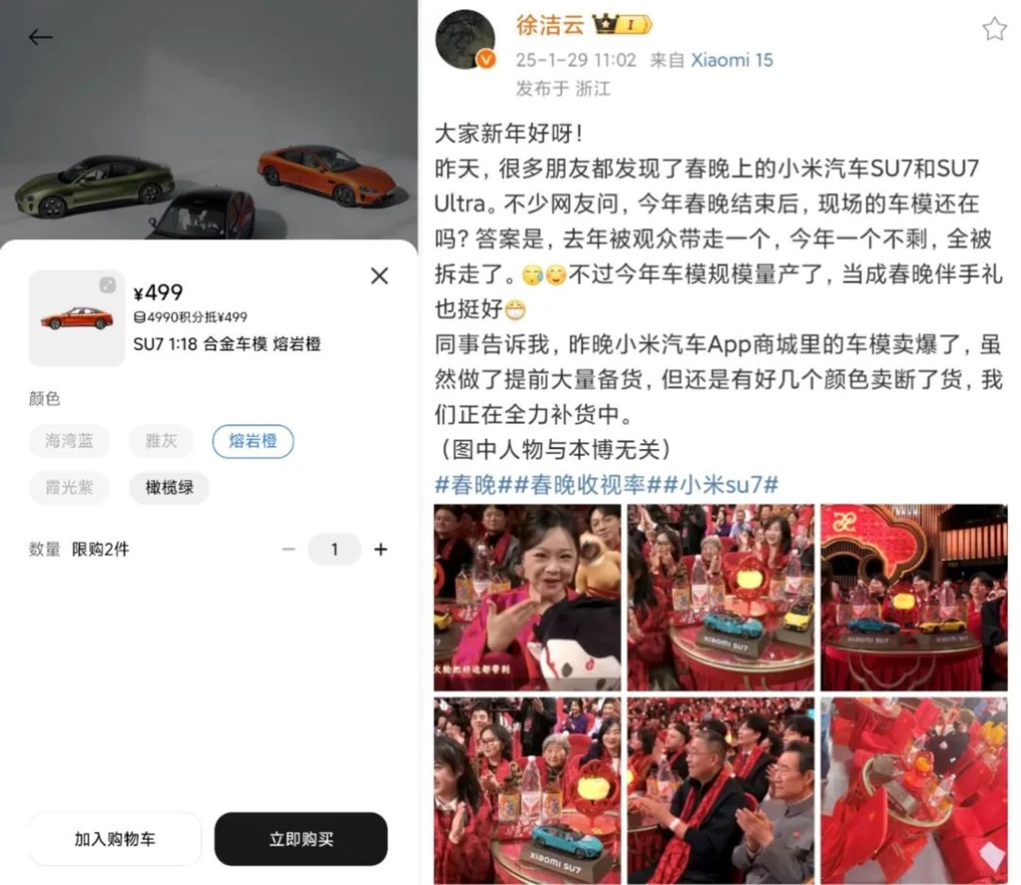 事实上,华为和小米,确实连续两年都登上了春晚舞台。但观感上似乎华为花的钱要比小米更多。SU7的车模作为摆件放在了前排嘉宾的桌上,春晚结束一天后,小米官方商城里的SU7模型几近售罄,也侧面反映出春晚的带货能力。而华为几乎随处可见,口播里有鸿蒙智行,主持人的背景板正中印着尊界字样,还有重庆会场几乎就是问界的展台。