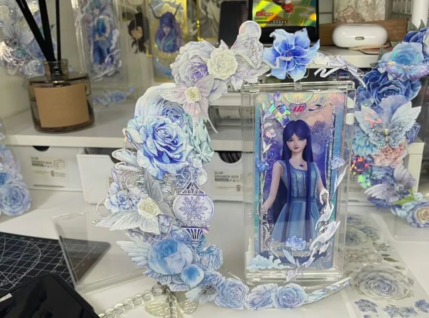 小绮所说的“谷美”是一种谷圈用语,是指专门与谷子搭配的装饰品,例如用丝带、干花制作的吧唧托,亦或是采用其他材料为立牌、亚克力挂件等周边产品制作的支架、收纳盒等。