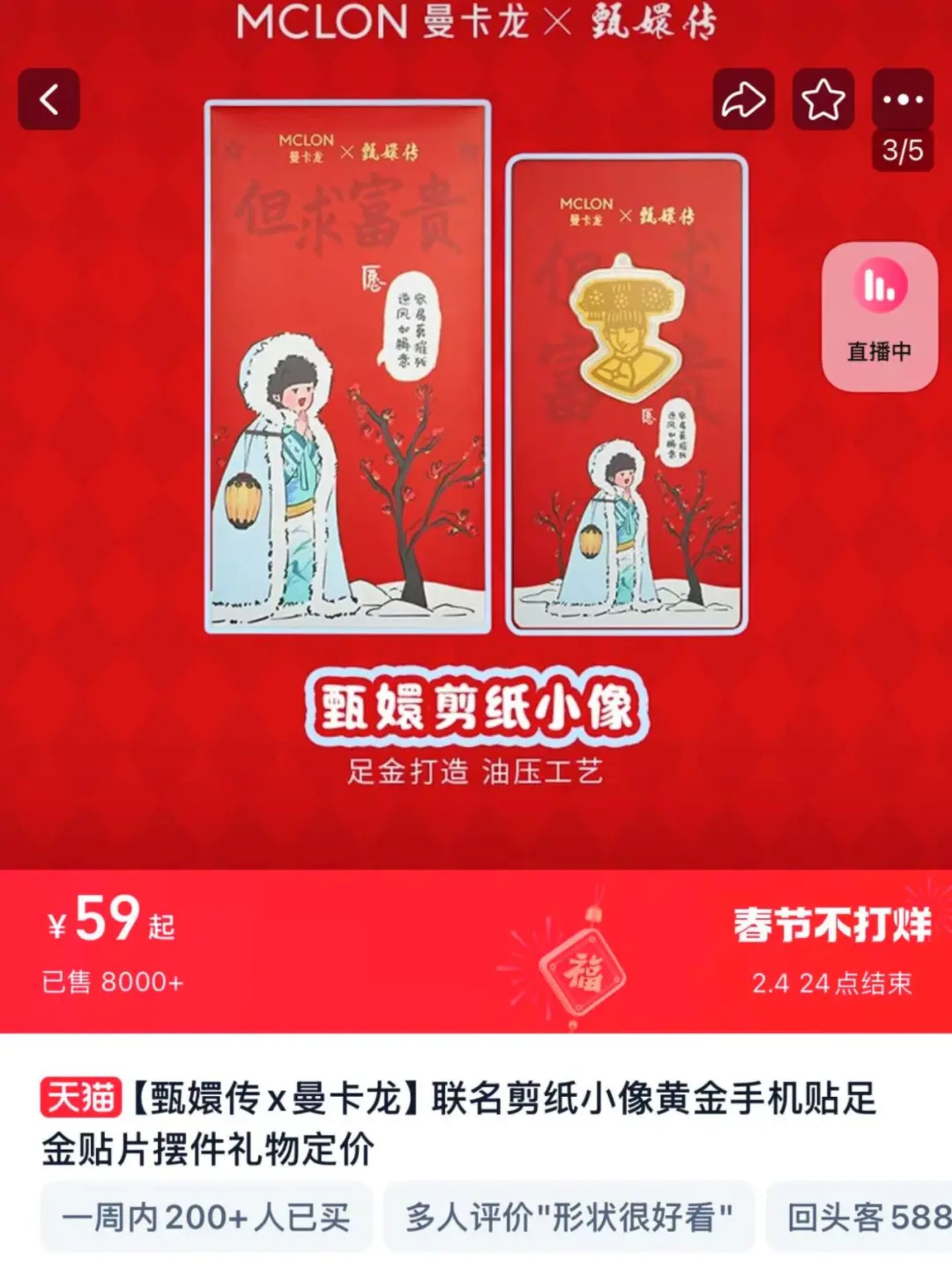 “现在我觉得最长久的还是甄嬛传的小卡。”当前,甄嬛传和曼卡龙联名推出的足金周边在淘宝上已售8000+,在闲鱼上有1000+人想要,常规小卡与《九重紫》小卡销量持平,最近势头正猛的《永夜星河》小卡销量领衔,在2000左右。