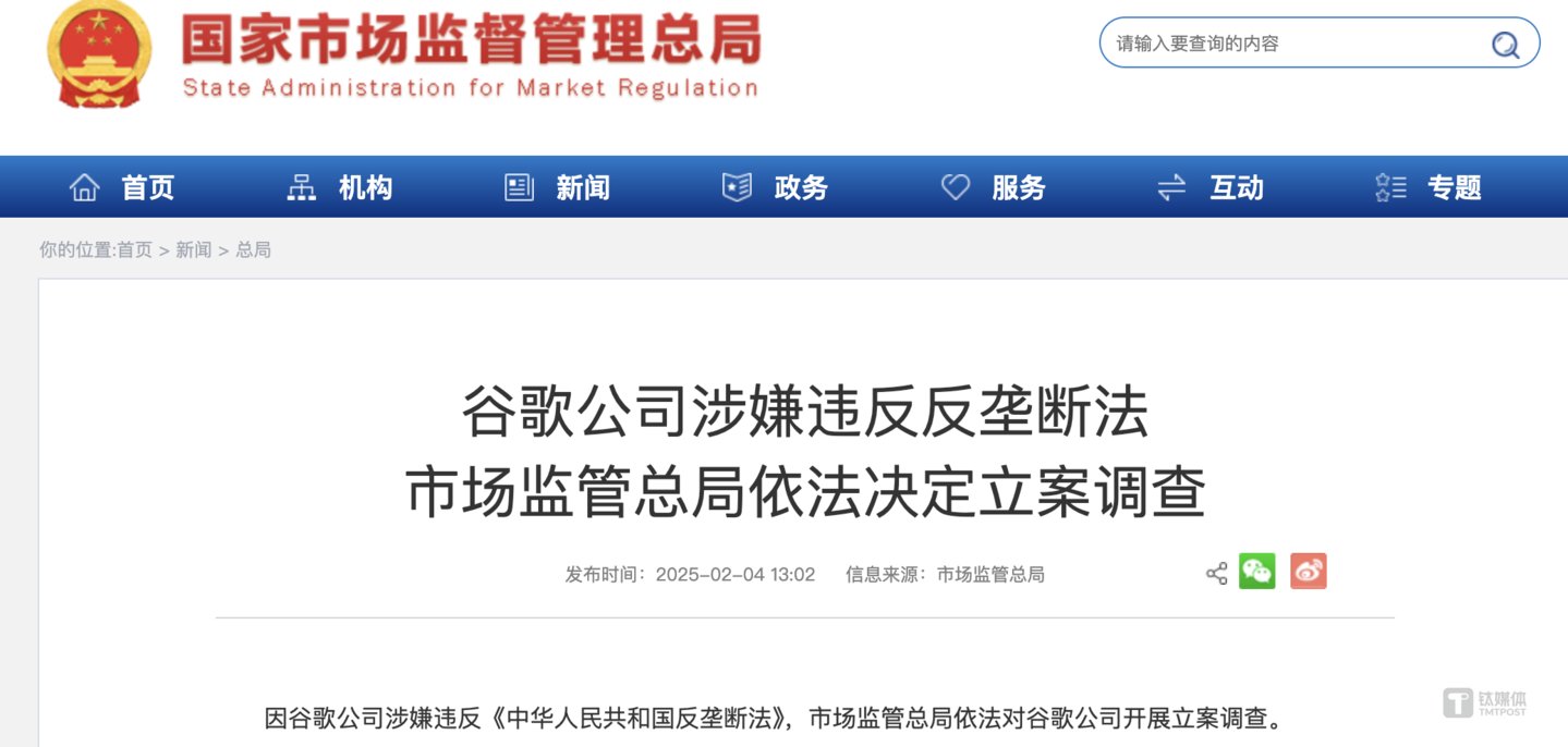钛媒体AGI 2月4日消息,国家市场监督管理总局发表声明称,因谷歌公司涉嫌违反《中华人民共和国反垄断法》,市场监管总局依法对谷歌公司开展立案调查。