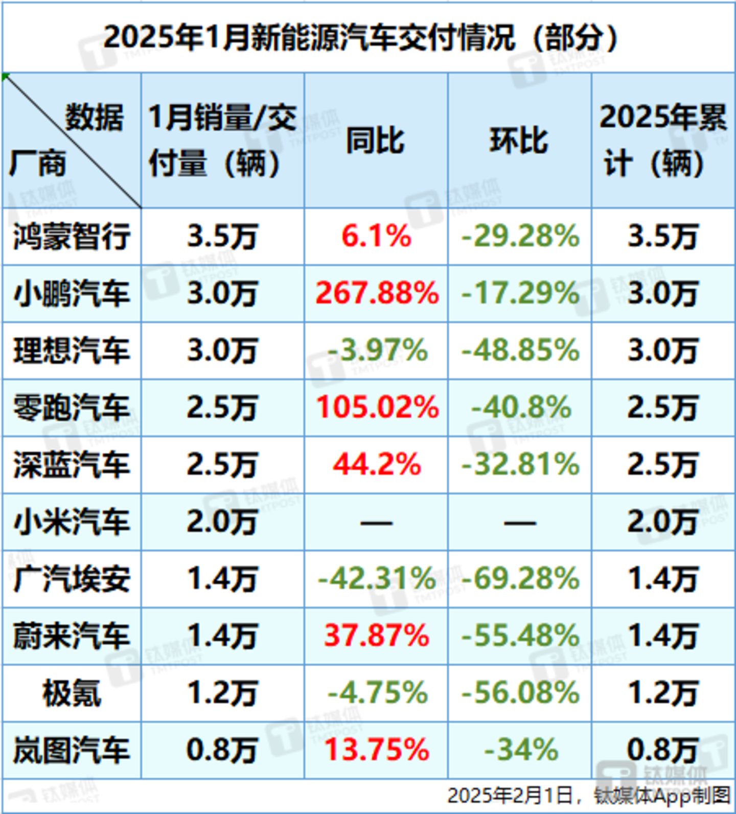 2月1日消息,车企公布今年1月新能源汽车的交付情况,2家交付量超3万,4家同比增超30%,环比增速全线翻绿。鸿蒙智行交付3.5万辆,同比增长6.1%,环比下降29.28%,这也是鸿蒙智行连续9个月交付超3万辆。小鹏交付3.0万辆,同比增长267.88%,环比下降17.29%,连续3个月交付超3万辆;理想交付3.0万辆,同比环比均下降。小米连续4个月交付量超2万,2025年全年交付目标30万台。