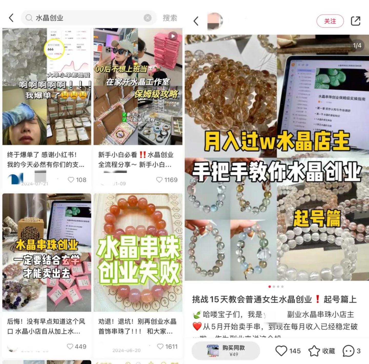得益于供应链的成熟,有不少许多新手和小商家都想赶上热潮,纷纷涌入水晶手串定制领域。他们会在小红书等平台上分享自己的创业经历,从进货渠道到制作过程,再到销售方式,都一一呈现给消费者。