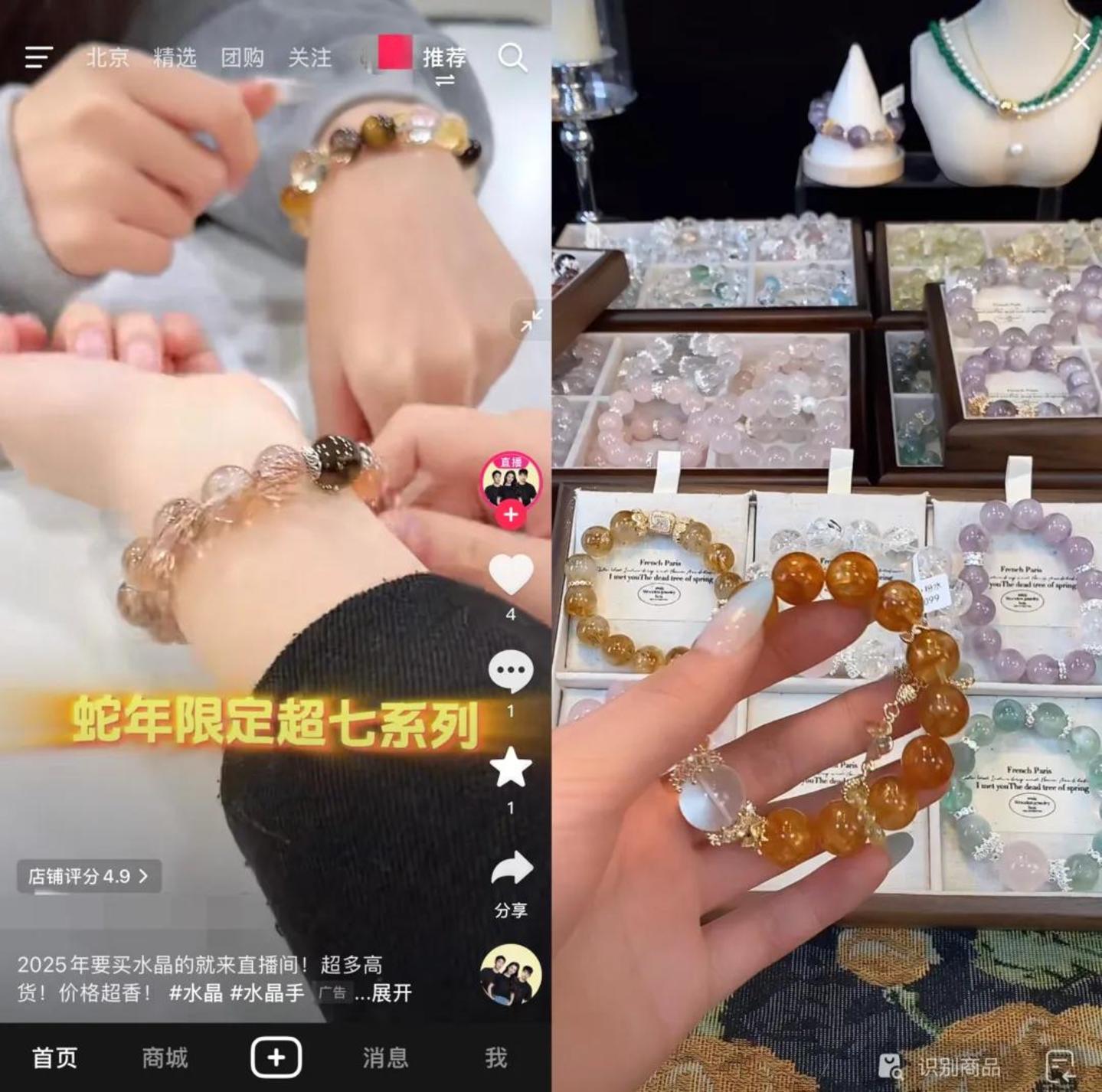 2025年春节,水晶手串在各平台和直播间内持续火爆,成了最热门“年货”之一。截至目前,小红书上与水晶相关的商品已超490万件;据蝉妈妈数据统计,近30天水晶手串的销量在75万-100万,近一年的销售额超亿元。
