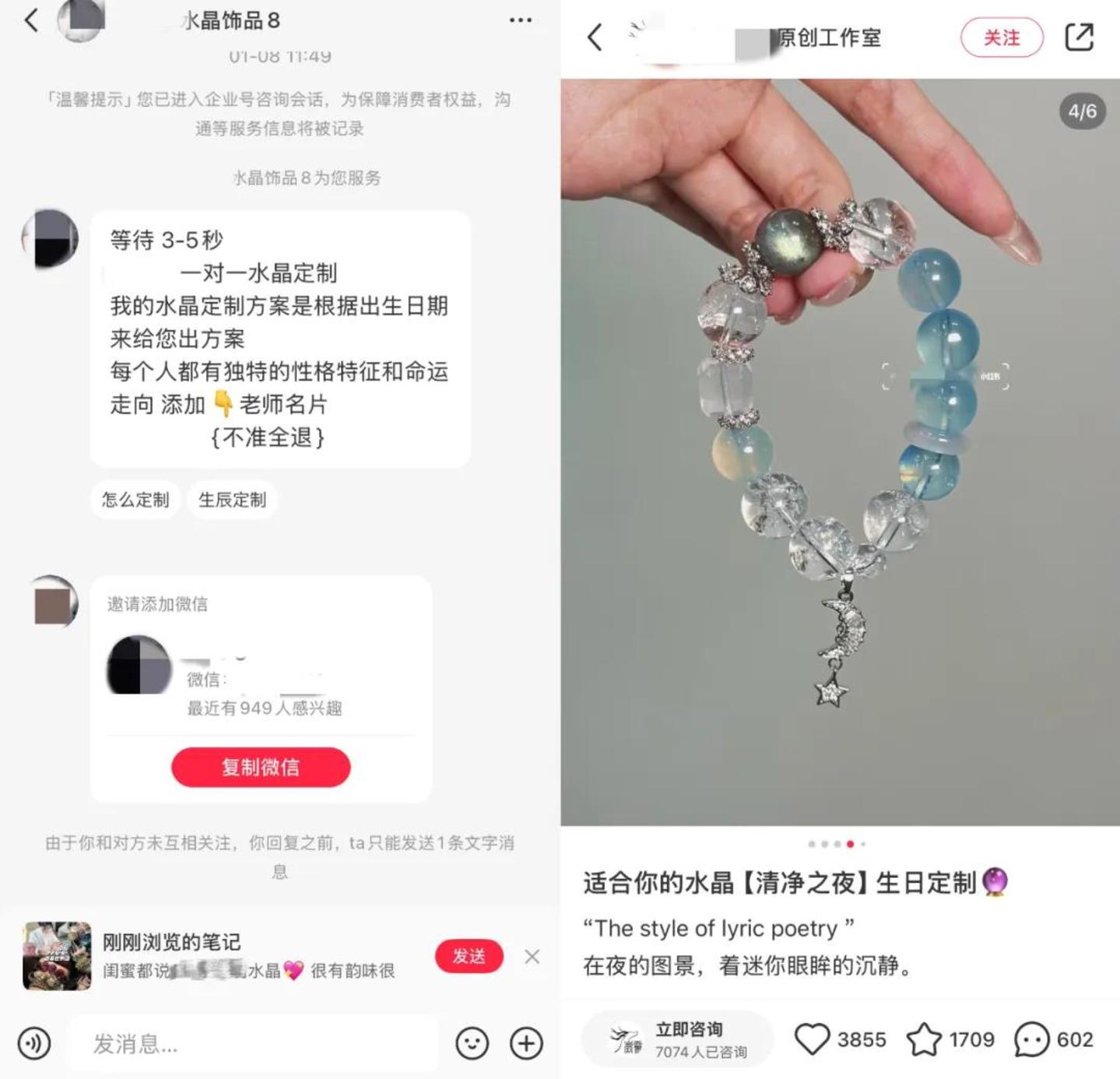 比如一些玄学博主、商家会先为消费者进行一对一的星盘和五行分析,再根据其分析结果推荐合适的水晶类型,并精心挑选珠子,搭配其他具有“灵性”的配件,再进行手工串制、消磁处理等。这种定制化的消费模式,让消费者在为水晶本身付费的同时,也在为其中的情绪价值买单。