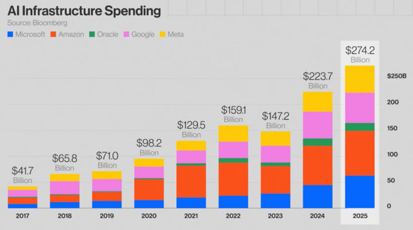 根据彭博预计,2025年全年微软、谷歌、Meta等公司在AI基础设施方面投入将达到2742亿美元。