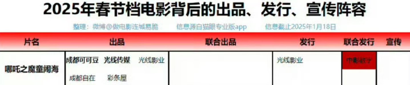 微博博主@做电影连城易跪统计了春节档电影背后的资本阵容,其中哪吒2的综合控制权高度集中在光线手中,其他影片则较为分散。本次光线世界上相对于《哪吒之魔童降世》已经降低了投资占比,向导演放权,助力其创作。而哪吒2这样一部准备了接近五年的续集,虽然对出品方而言一次性投资回报率不低,但要复制这种成功的难度同样不低。