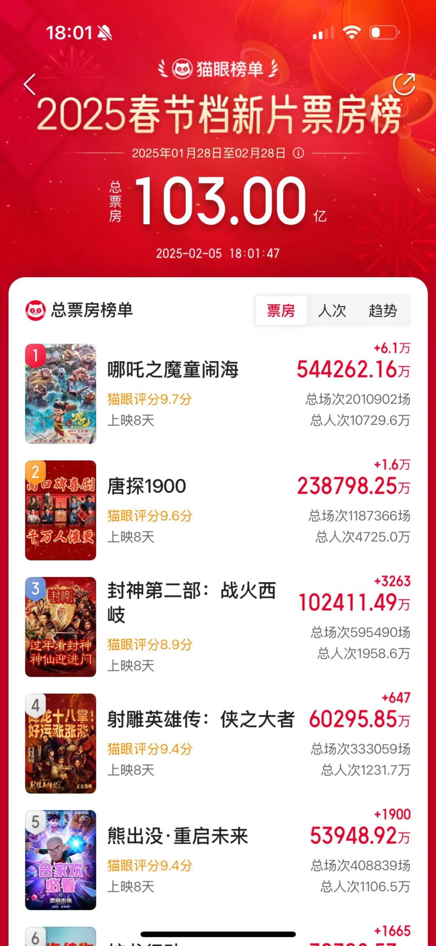 而且,目前这一火热态势还在延续。其中,《哪吒之魔童闹海》《唐探 1900》《封神第二部:战火西岐》分列春节档票房榜前三位,成为引领今年春节档热度的主力军。