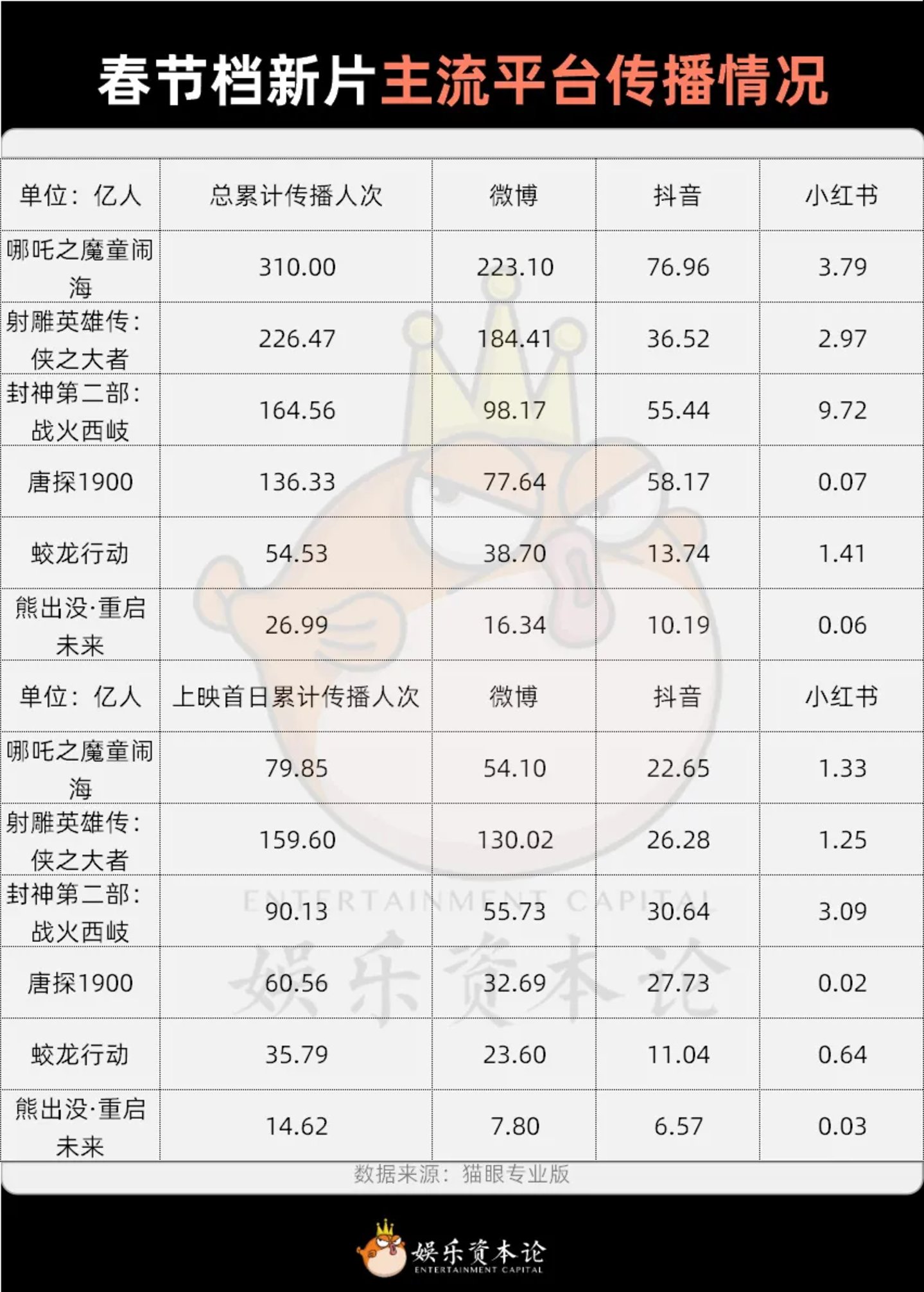 根据猫眼春节档新片传播战报,六部影片的营销特点各不相同。《射雕英雄传:侠之大者》映前传播最努力,但口碑困于小部分群体之间;《哪吒之魔童闹海》抖音传播人数在绝对值和增幅上都领跑其他影片,展现出视效大片的优势;《封神第二部:战火西岐》小红书传播人数领跑,除了殷郊法相和妲己美貌,邓婵玉的角色塑造同样值得讨论;《唐探1900》各个主流平台平均发力,重点突出喜剧元素;《蛟龙行动》微博传播力度最大,可见主要阵地仍在粉丝群体之间,同样存在口碑无法破圈的问题;《熊出没·重启未来》不靠营销就能抓牢基本盘,如何不让其他片方羡慕。