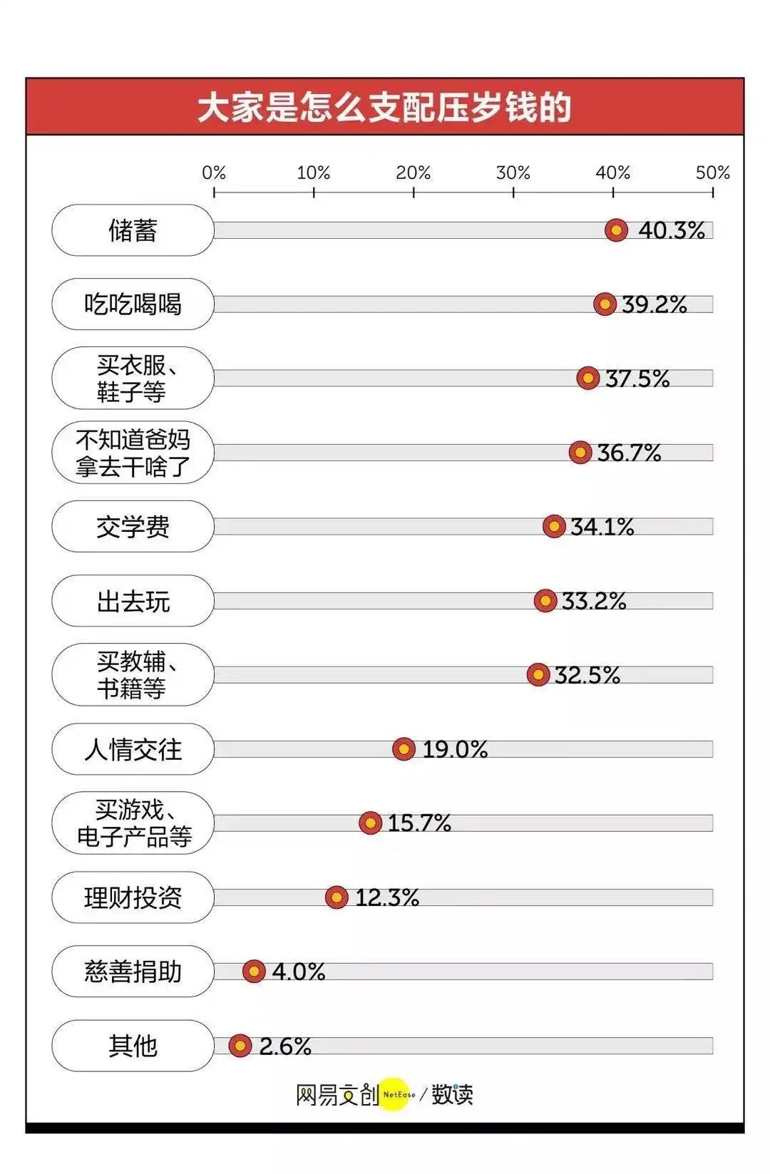 而压岁钱主要去哪了呢?从报告可看,占比最高的就是储蓄,这也是为什么银行争相“抢夺”压岁钱的原因。