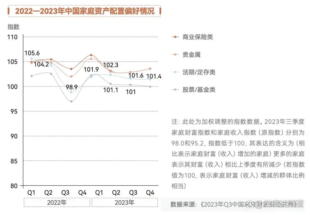 根据中国家庭金融调查与研究中心和蚂蚁研究院联合发布的《2023年Q3中国家庭财富变动趋势》报告显示,2022年以来,中国家庭在资产配置过程中,存在明显的低风险偏好。从图中可见,2023年以来中国家庭对于股票/基金类产品的配置意愿,处于下降区间,同样处于下降区间的投资品还有活期/定存类产品。