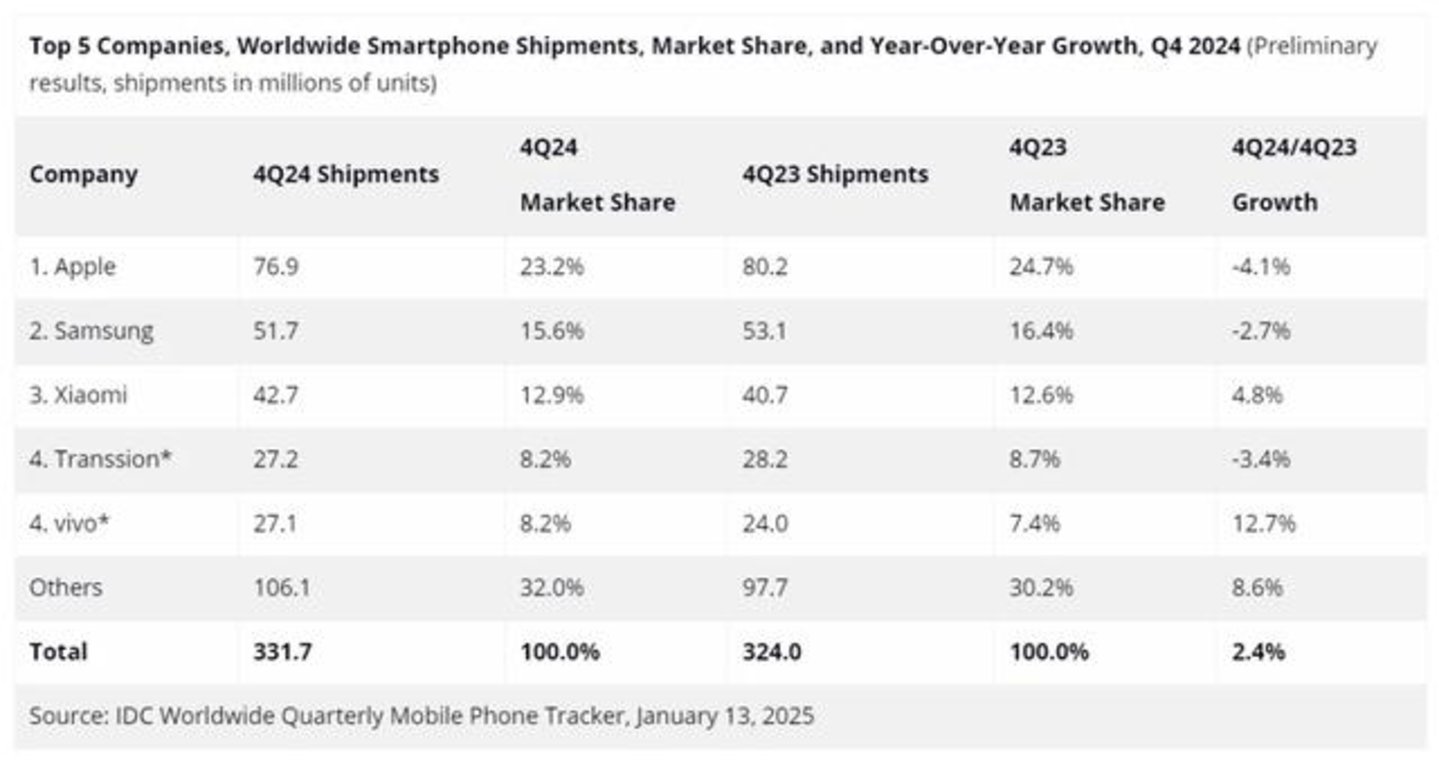 三星在2024年开了个好年,凭借S24旗舰系列和Galaxy AI强劲开局,但2024年四季度收尾就显得虎头蛇尾。由于未推出Galaxy S25系列新款旗舰,加之小米、OPPO、vivo等新机的冲击,其市场份额也有所下降,同比下滑2.7%。