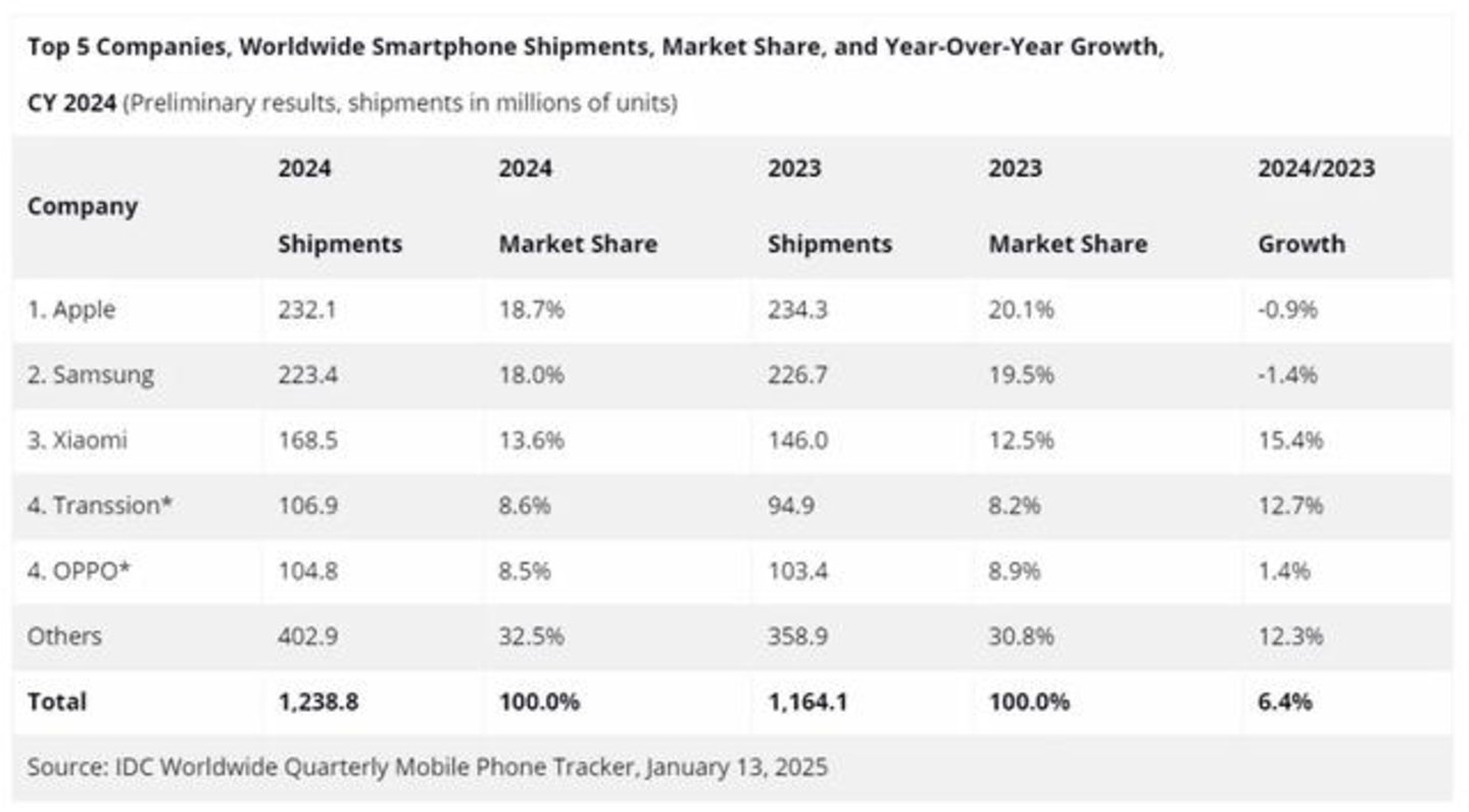 苹果和三星2024年保持全球前两名的地位,但同比分别减少0.9%、1.4%,其市场份额也因国内厂商的快速增长而缩小。小米出货量达到1.68亿台,同比增长15.4%,增速最为显著。传音紧随其后,出货量达到1.06亿台,同比增长12.7%。尽管OPPO出货量同比增长1.4%,但市场份额因跑输全市场增速而略有下降。