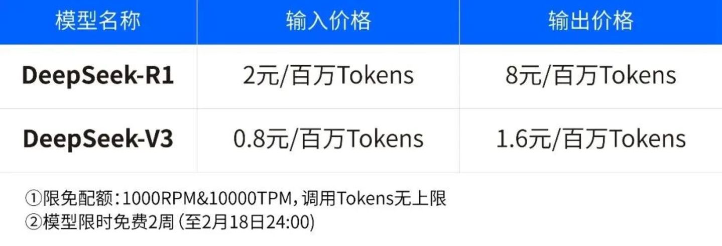 而百度云上架的对应模型调用价格为:DeepSeek-V3官方刊例价为输入0.8元/M tokens,输出1.6元/M tokens,DeepSeek-R1的价格也为官方价格的一半,并提供限时2周的免费服务;阿里云百炼上架的DeepSeek-R1和DeepSeek-V3也宣布限时免费1000万tokens。