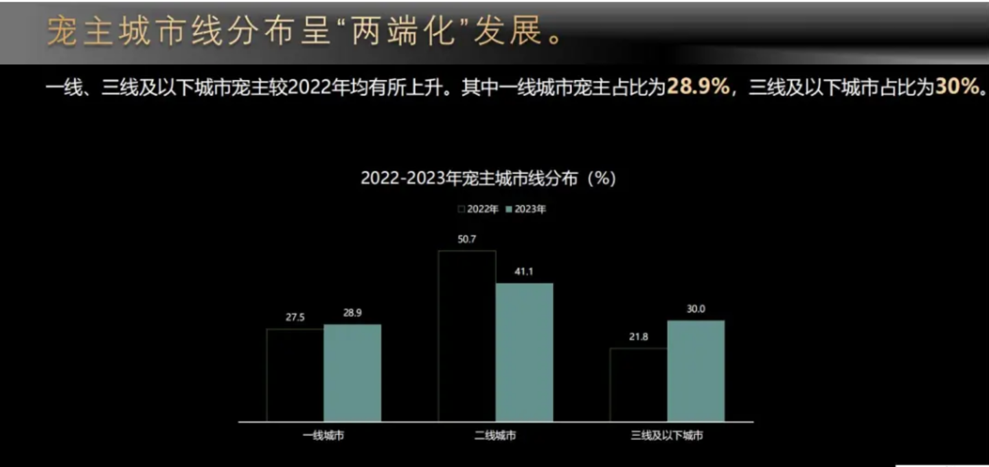 根据《2023年-2024中国宠物行业白皮书》,2022年—2023年,三线及以下城市的宠主占比从21.8%扩大到30%,大幅提升8.2个百分点。相较之下,一线城市宠主的占比仅提升1.4个百分点,二线城市宠主占比则缩小了近10个百分点。