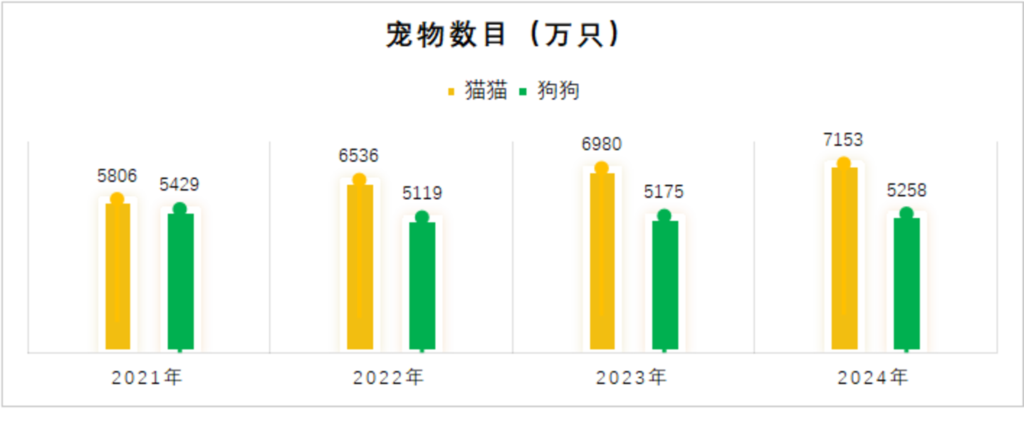 根据派读宠物行业大数据,2023年宠物猫为6980万只,较2022年增长了6.8%,而宠物犬为5175万只,较2022年增长了1.1%。2024年,宠物猫的数量进一步增长至7153万只,宠物犬数量为5258万只,差距继续扩大。
